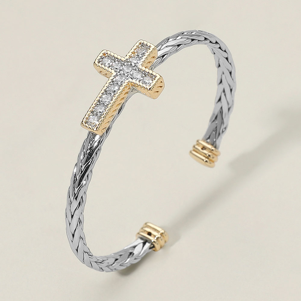 Details • Size : 0.7" H, 2.25" D • Cuff • Chic open cuff bracelet showcasing a detailed cross charm with shimmering accents. Designed with a textured woven band and polished ends, offering a sleek and stylish finish. A versatile accessory that enhances everyday outfits or special occasions. • CZ Cubic Zirconia