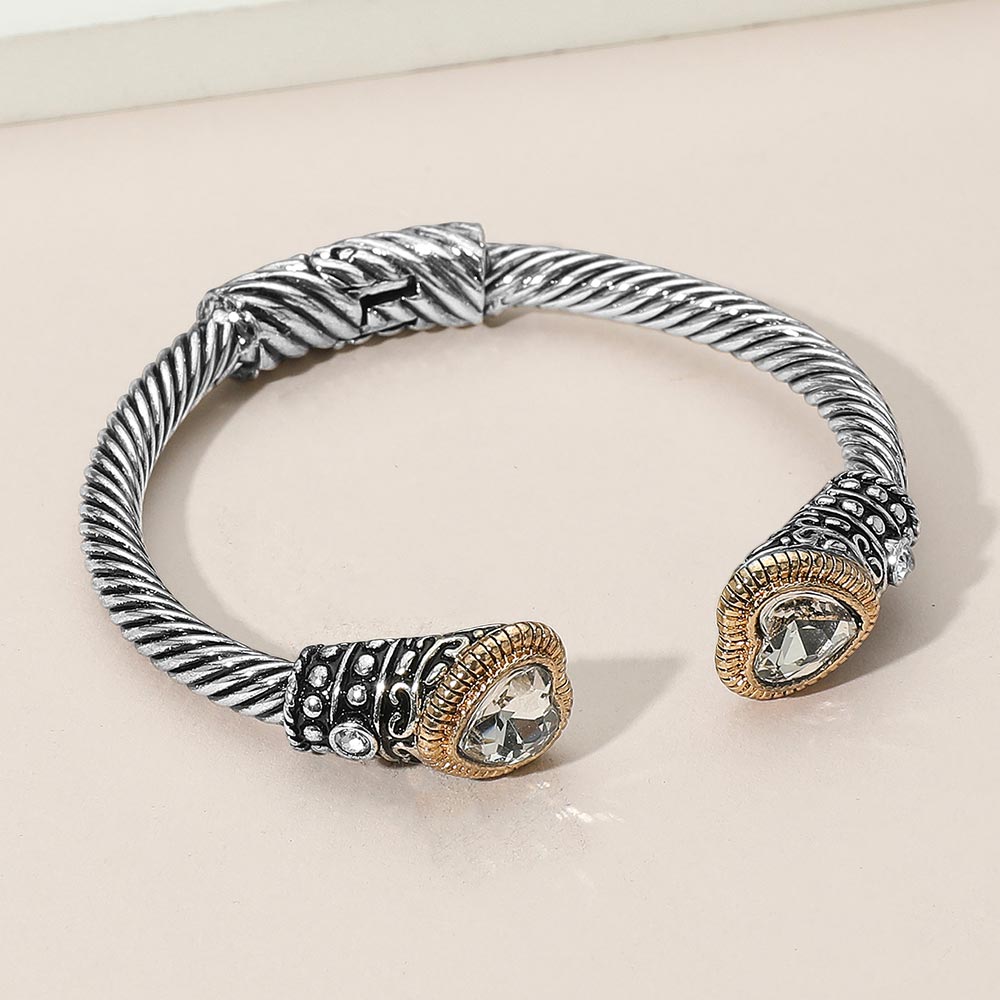Details • Size : 0.6" H, 2.4" D • Hinged Closure / Cuff • Elegant open cuff bracelet with textured rope detailing and heart-shaped ends framed in ornate patterns. A refined accessory that blends classic style with intricate artistry. • Lead and Nickel Compliant