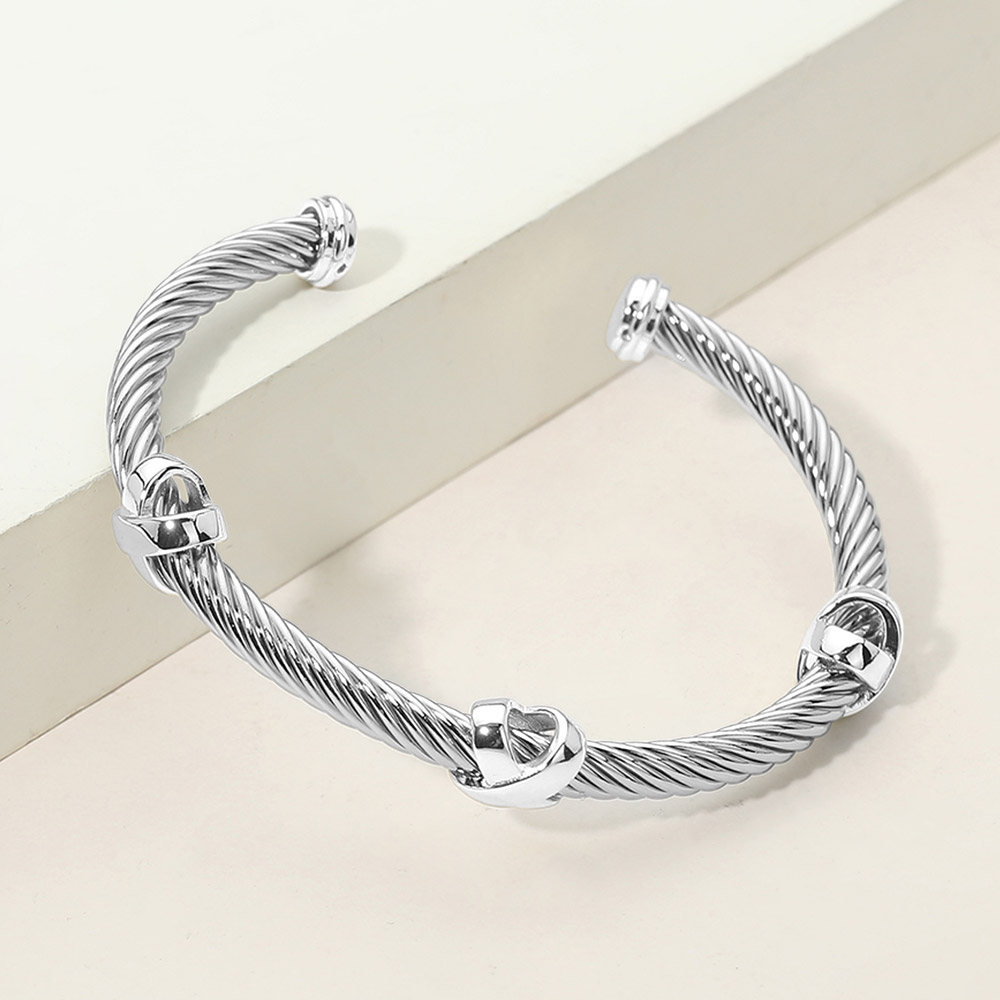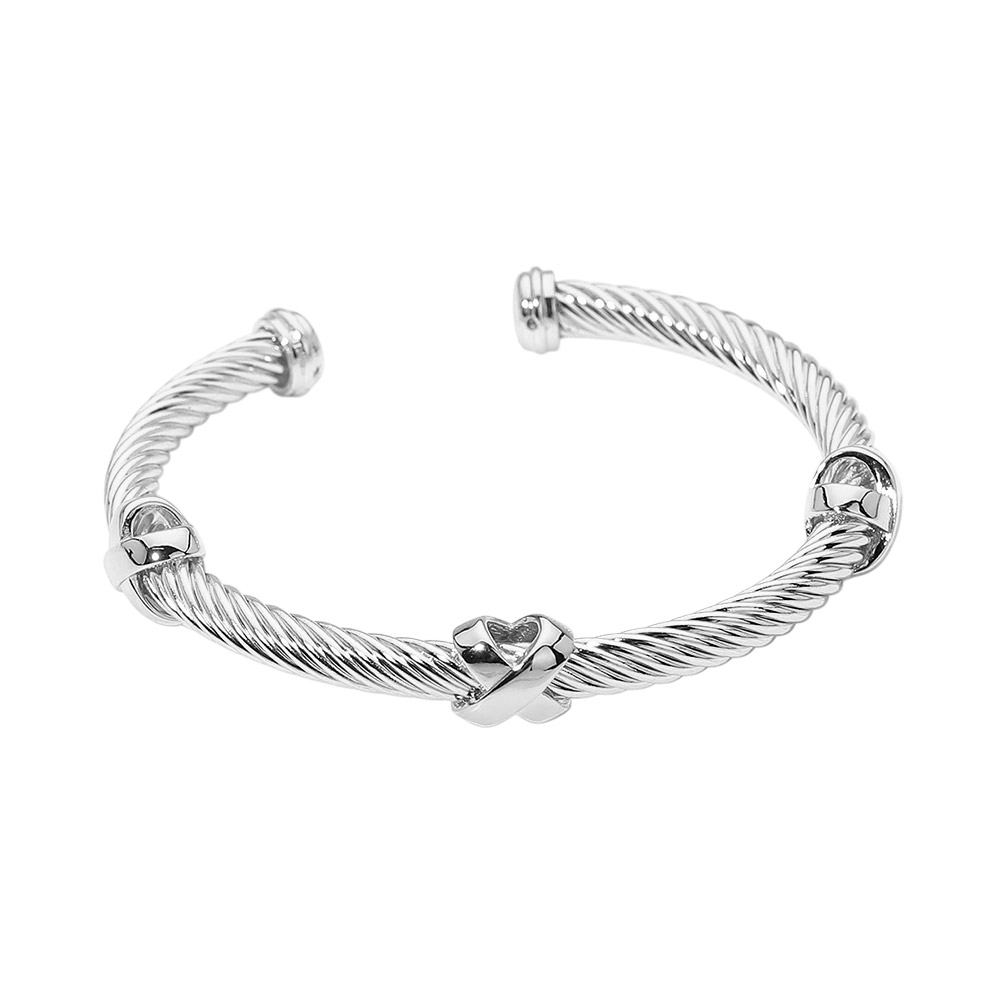 Details • Size : 0.3" H, 2.3" D • Cuff • Elegant open cuff bracelet featuring a twisted cable design with a sculpted heart accent at the center. Designed for easy wear and everyday styling, this timeless cuff adds a refined touch to casual and elevated looks, making it a versatile choice for boutiques, gifting, and layered jewelry collections.