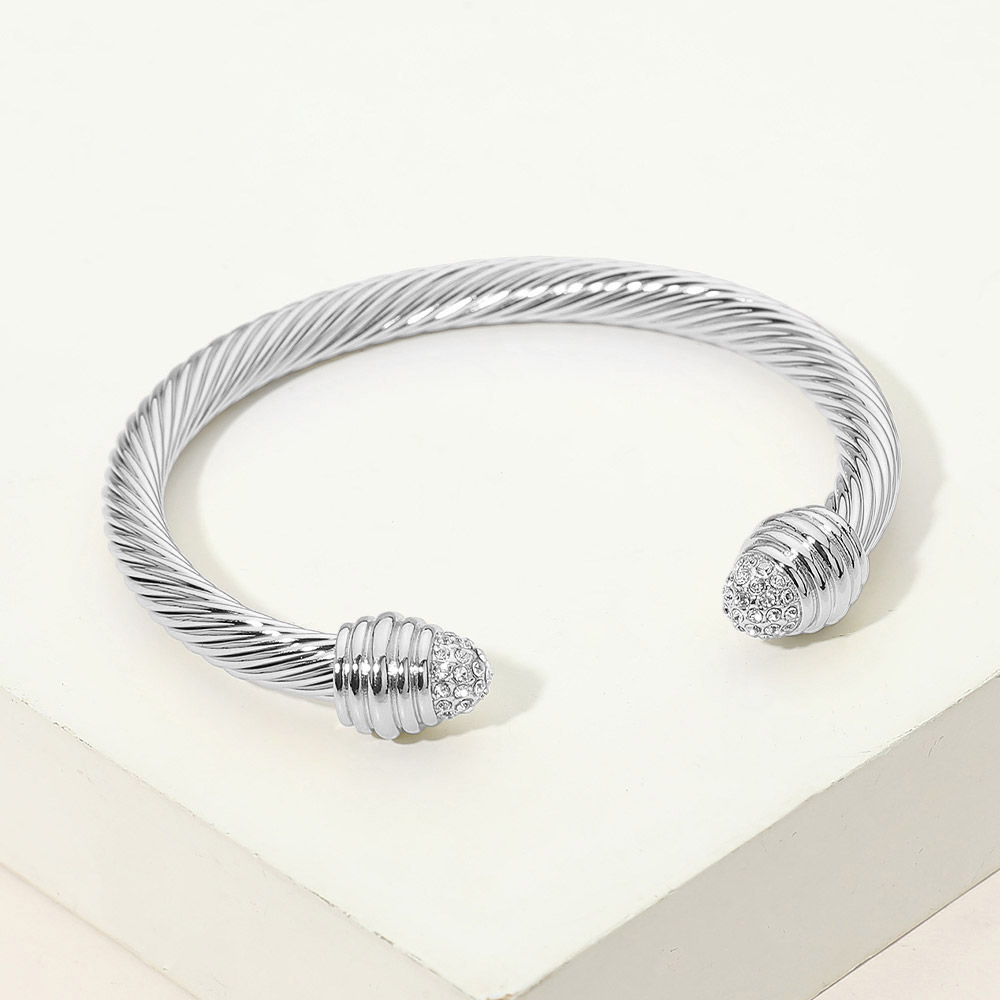 Details • Size : 0.3" H, 2.3" D • Cuff • Sleek open cuff bracelet featuring a twisted cable silhouette finished with sparkling crystal accent end caps. Designed for comfortable slip-on wear, this statement bracelet adds refined shine and modern elegance to everyday outfits, special occasions, and layered wrist styling. Perfect for gifting or boutique collections. • CZ Cubic Zirconia