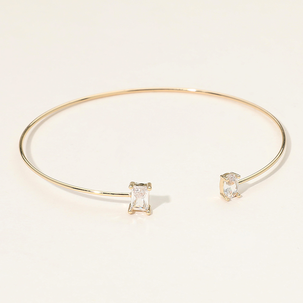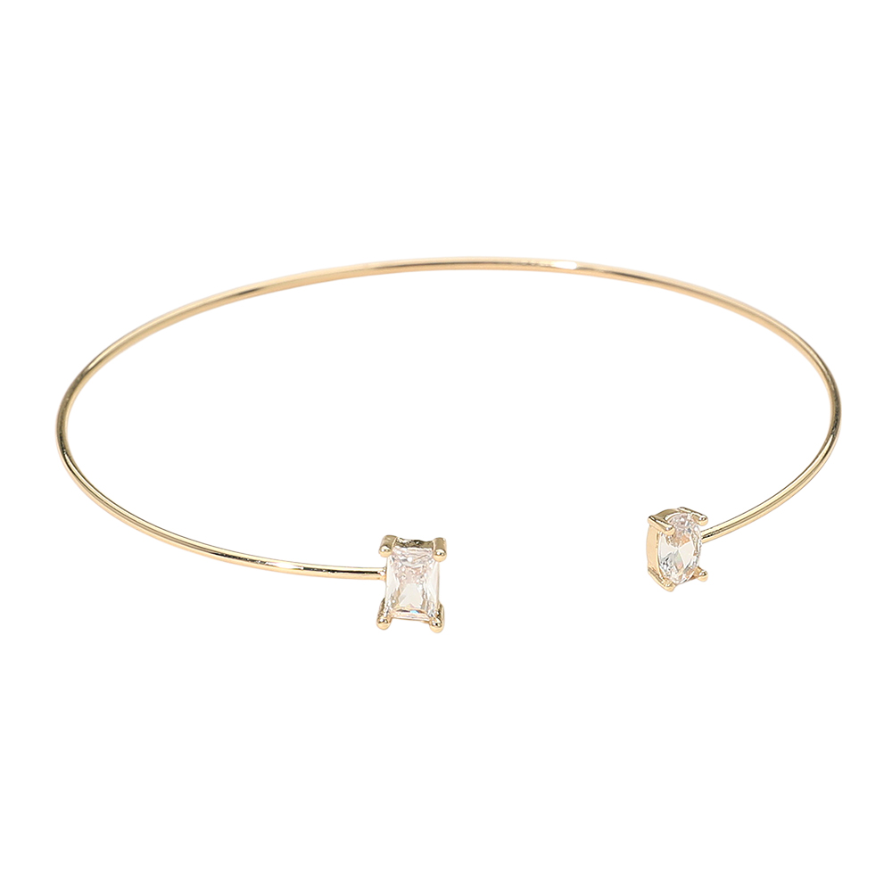 Details • Size : 0.25" H, 2.5" D • Cuff • Modern open cuff bracelet featuring two refined crystal accents for balanced sparkle and clean elegance. Designed for easy wear and versatile styling, this sleek piece transitions effortlessly from casual looks to elevated outfits, perfect for stacking or wearing solo as a statement accessory. • Brass