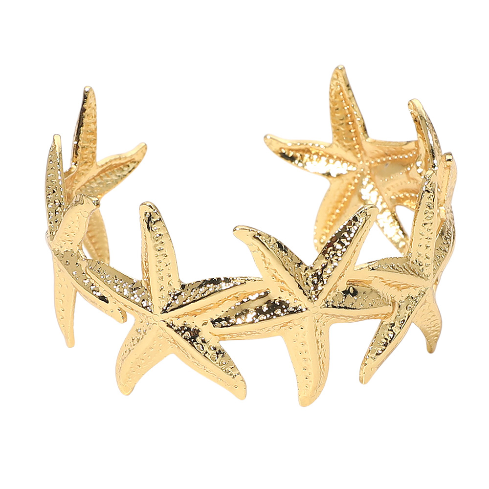 Details • Size : 1.25" H, 2" D • Cuff • Water Resistant • Eye-catching stainless steel cuff bracelet featuring sculpted starfish shapes arranged in a bold statement design. Easy to slip on and comfortable for all-day wear, this ocean-inspired accessory adds texture, dimension, and standout style to resort looks, vacations, and everyday outfits. • Hypoallergenic • Stainless Steel