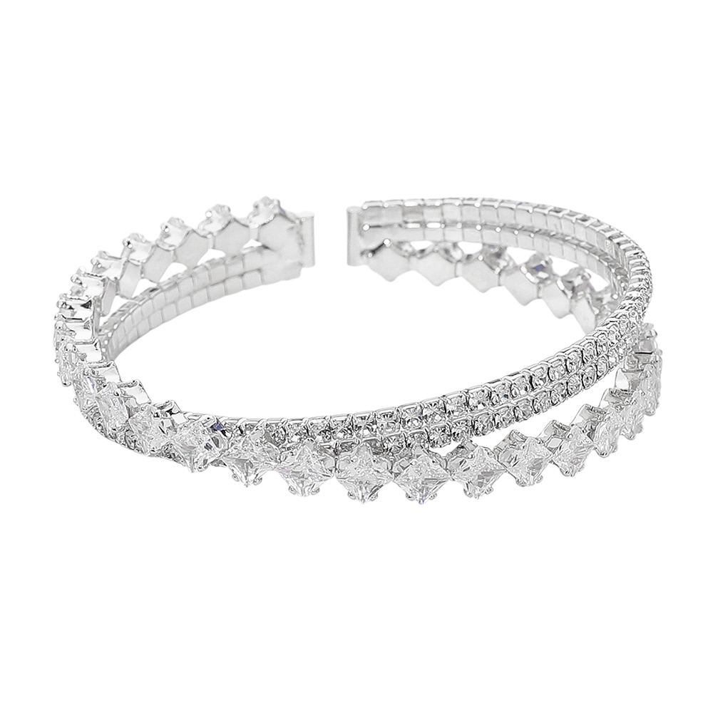 Details • Size : 0.6" H • Adjustable • Elegant cuff bracelet featuring dual rows of sparkling cz stones in a refined open design. Adjustable for a comfortable fit, this glamorous bracelet adds instant shine to evening wear, weddings, or special occasions, blending sophistication with timeless sparkle. • CZ Cubic Zirconia • Lead and Nickel Compliant