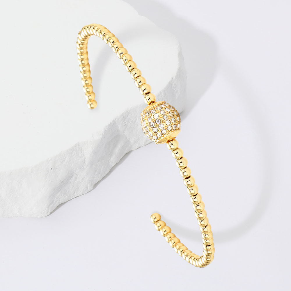 Details • Size : 0.35" H • Cuff • Elegant open cuff bracelet designed with polished beads and a sparkling pave-set center bead. Lightweight and stylish, this bracelet adds a refined shimmer, making it a versatile accessory for casual or formal looks. • Lead and Nickel Compliant