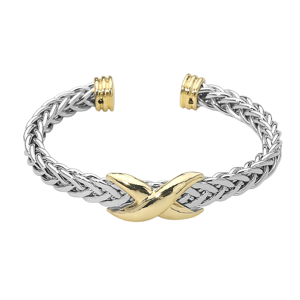 Details • Size : 0.5" H, 2.25" D • Cuff • Elevate your look with this braided cuff bracelet featuring a striking gold-tone X centerpiece. The intricate woven band blends modern design with classic elegance, while the open cuff style ensures easy wear. A bold yet timeless accessory perfect for any occasion.