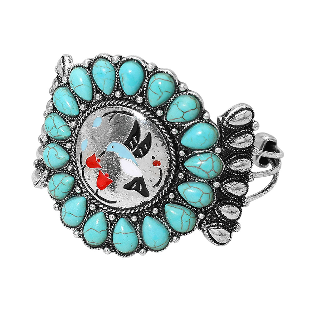 Details • Size : 2.1" H, 2.5" D • Cuff • Make a bold statement with this western-inspired hummingbird cuff bracelet featuring an ornate center scene framed by faceted teardrop accents. The adjustable open design sits comfortably on the wrist, adding radiant sparkle and artistic flair to casual outfits, festivals, or special events. • Lead and Nickel Compliant