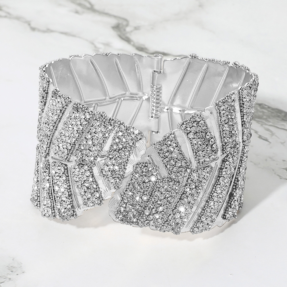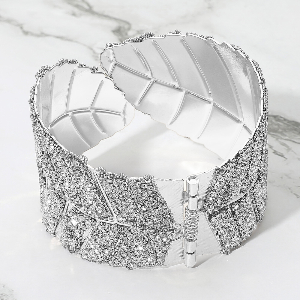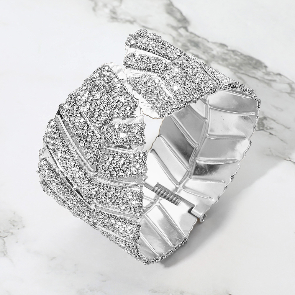Details • Size : 2" H, 2.75" D • hinged Closure / Cuff • Bold wide cuff bracelet with an intricate leaf-inspired design encrusted with sparkling crystals. This glamorous statement piece elevates any outfit, perfect for evening events, parties, or special occasions. A luxurious accessory that adds dazzling shine and sophisticated elegance to your look. • Lead and Nickel Compliant