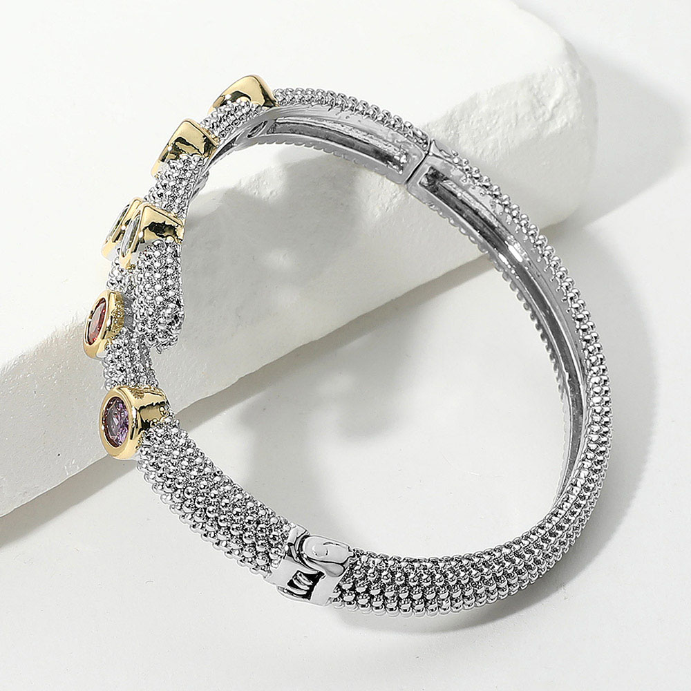 Details • Size : 0.5" H, 2.4" D • Hinged Closure • Elevate your style with this multi-stone cuff bracelet, featuring a textured finish and dual-tone accents for a modern yet timeless appeal. The open wrap design showcases an array of faceted stones, adding vibrant detail to this versatile accessory for day or evening wear. • Gold Dipped • CZ Cubic Zirconia