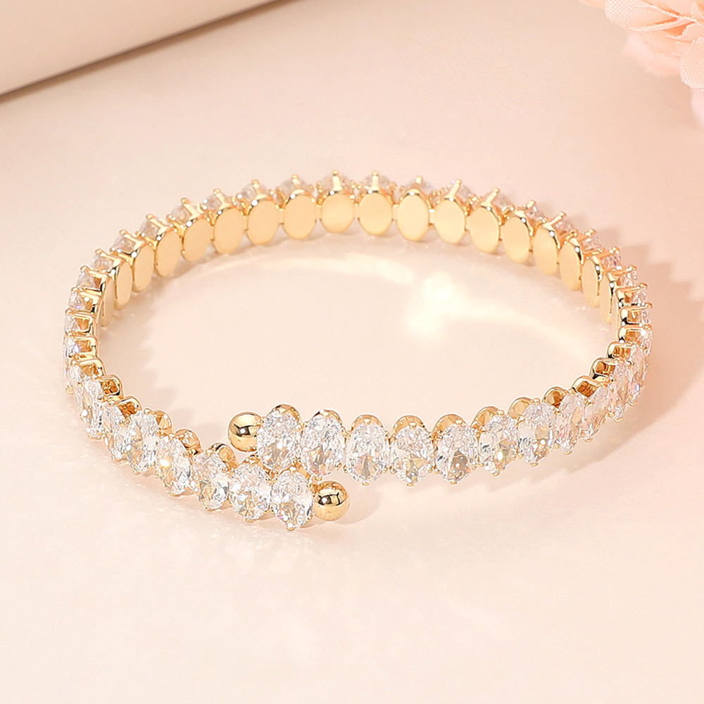 Details • Size : 0.25" H • Adjustable • Elevate your style with this marquise crystal open cuff bracelet, featuring a stunning row of oval-cut stones that shimmer with every movement. Its elegant open-ended design adds a modern twist to timeless glamour, making it a perfect accent for evening wear or special celebrations. • CZ Cubic Zirconia • Lead and Nickel Compliant