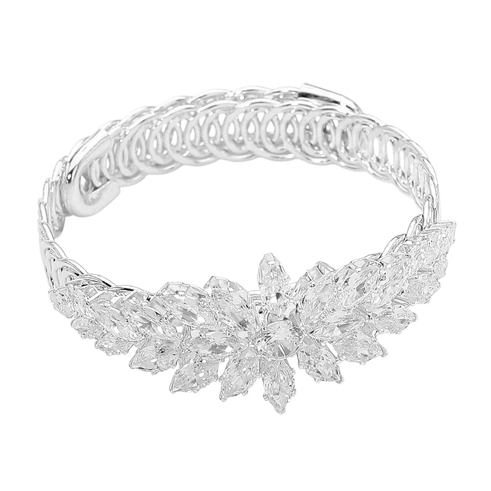 Details • Size : 0.9" H • Adjustable • Stunning bracelet featuring marquise-cut crystal clusters arranged in a refined floral design with an adjustable band for a comfortable fit. A beautiful accessory for weddings, formal events, and special occasions, adding timeless sparkle to any style. • CZ Cubic Zirconia • Lead and Nickel Compliant
