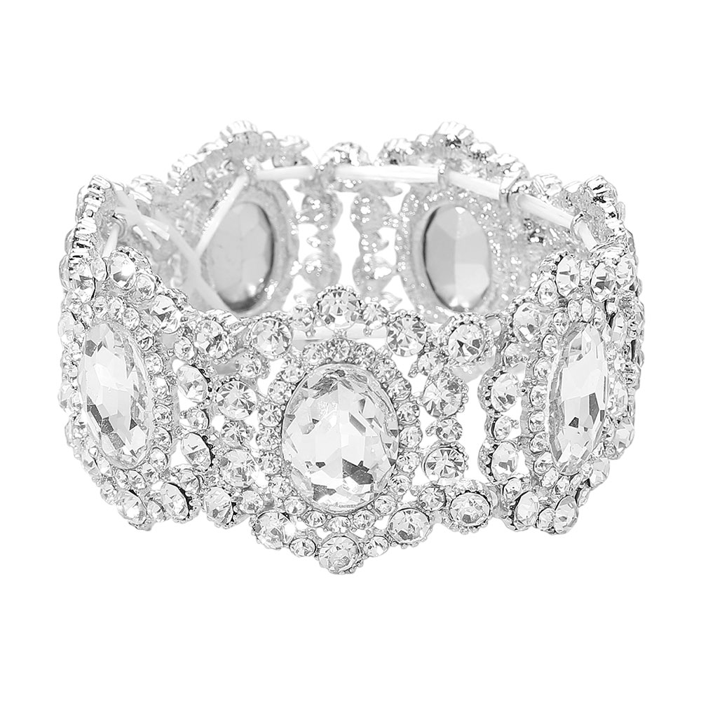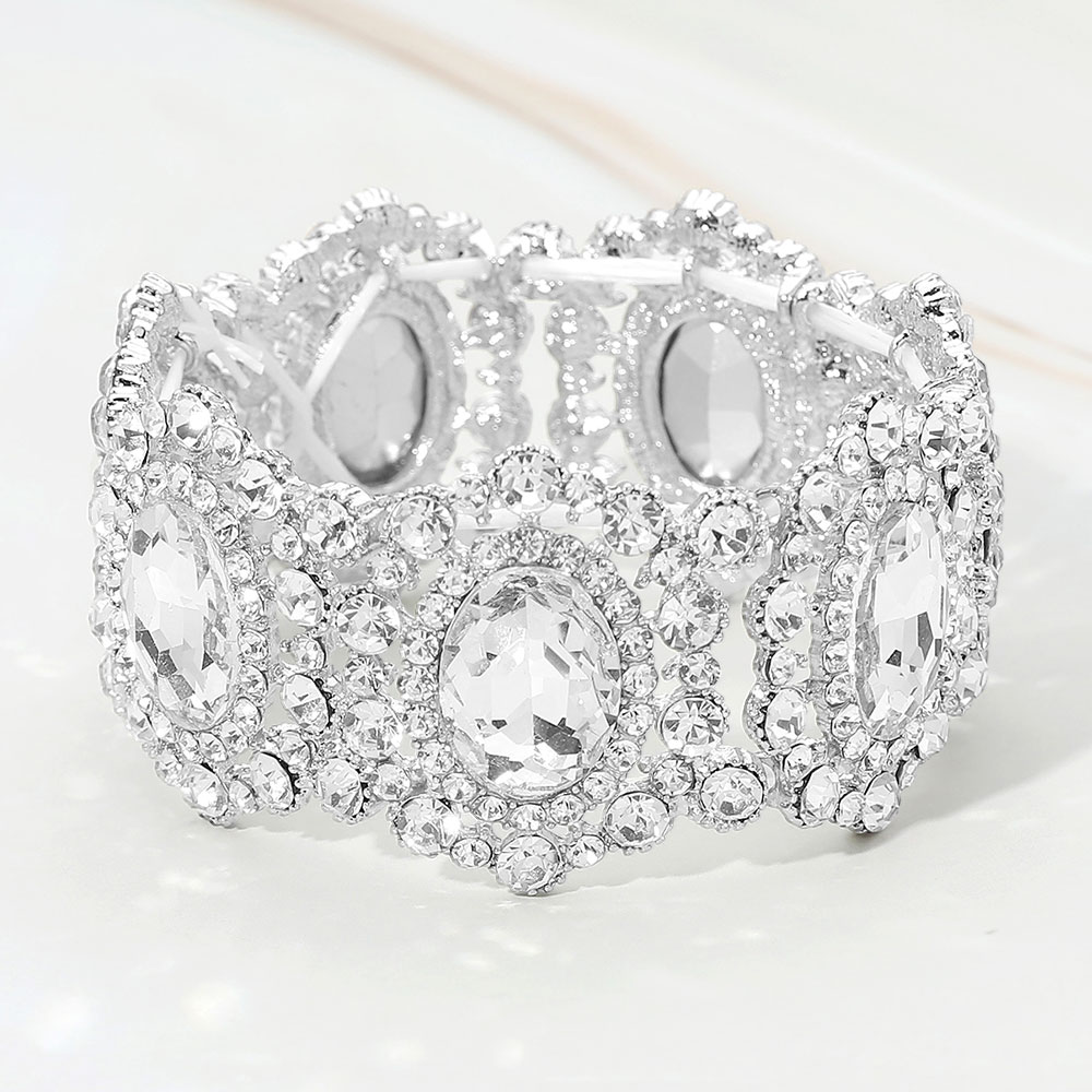 • Eye-catching stretch bracelet featuring oval center accents surrounded by layered crystal detailing. Designed to deliver bold elegance with comfortable wear, this statement bracelet elevates evening looks, special occasions, formal outfits, and standout everyday styling with timeless glamour.