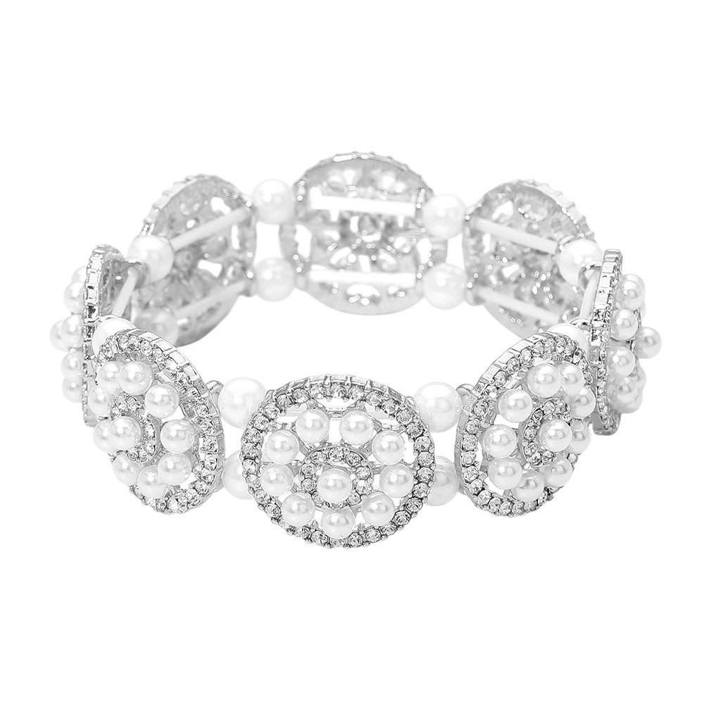 • This round pearl accent stretch bracelet features linked circular stations with layered bead detailing and a flexible slip-on fit. Designed for effortless styling, it pairs easily with everyday outfits, dress looks, special occasions, gifting, boutiques, and elegant accessory collections.