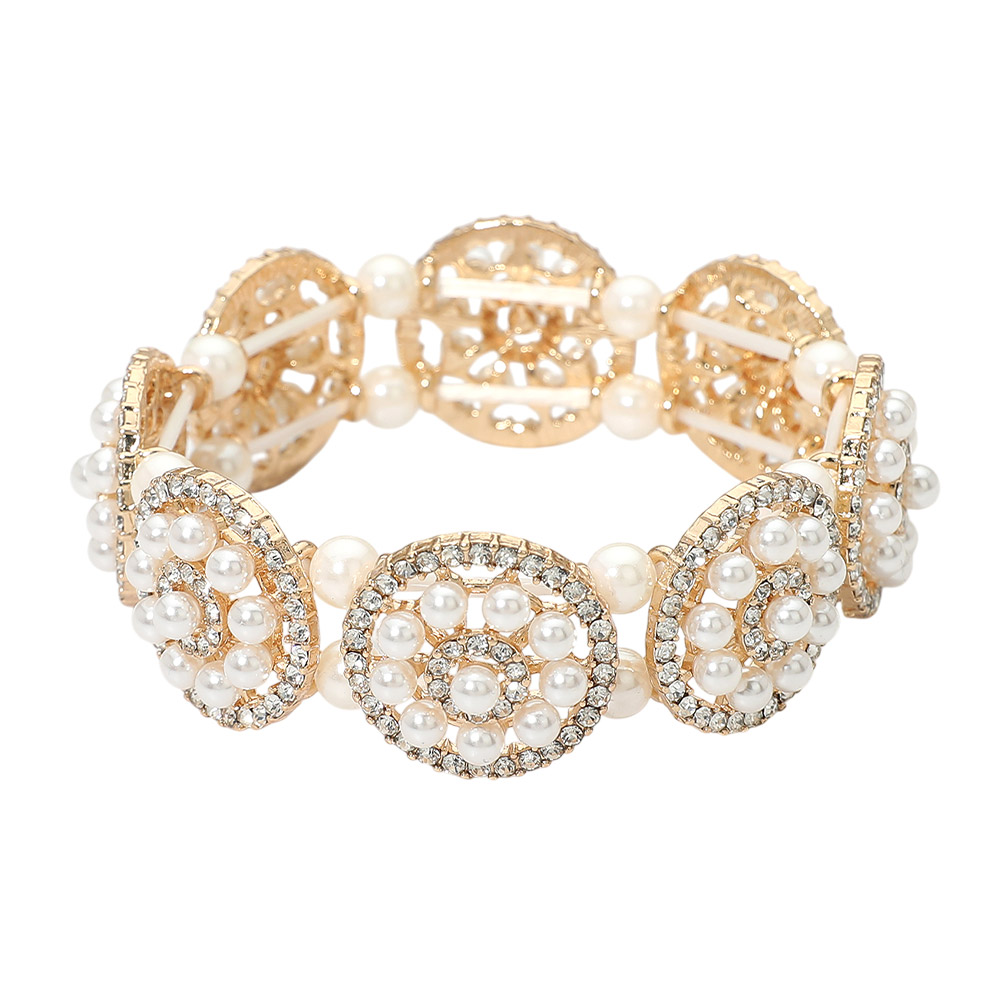 • This round pearl accent stretch bracelet features linked circular stations with layered bead detailing and a flexible slip-on fit. Designed for effortless styling, it pairs easily with everyday outfits, dress looks, special occasions, gifting, boutiques, and elegant accessory collections.