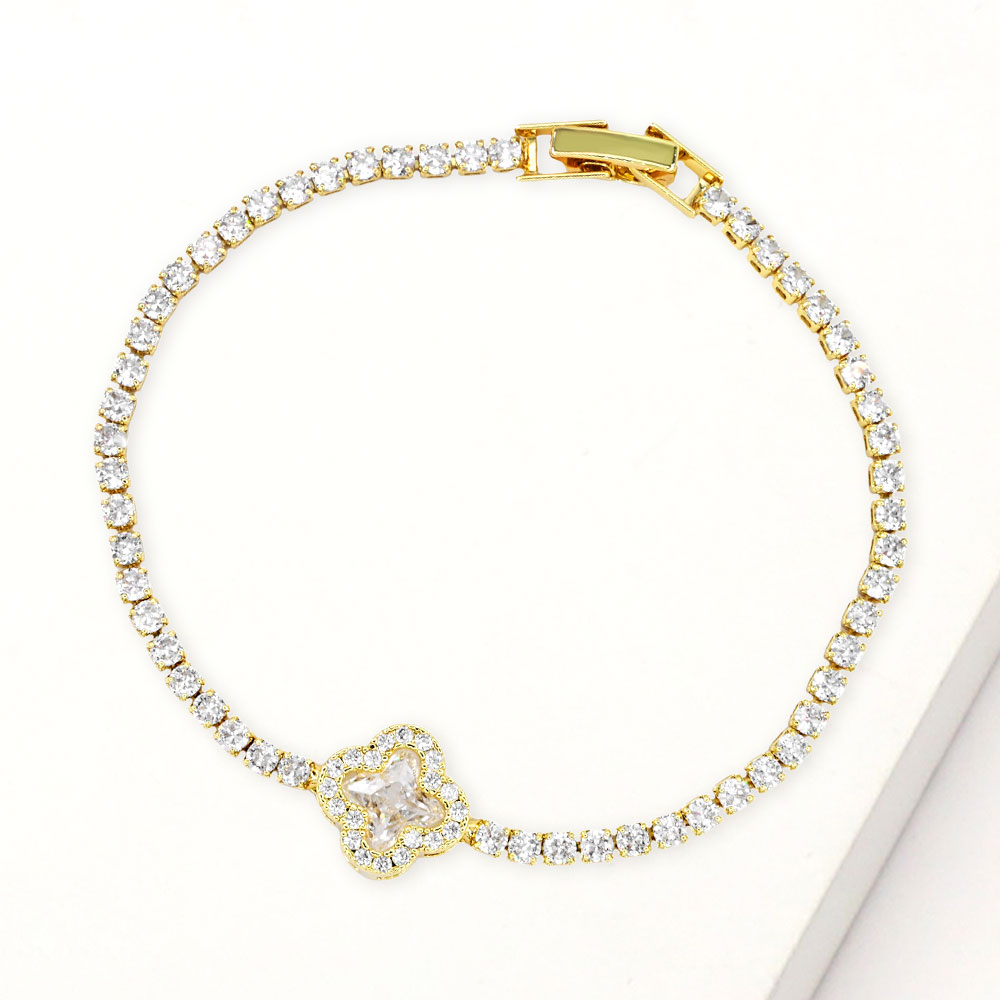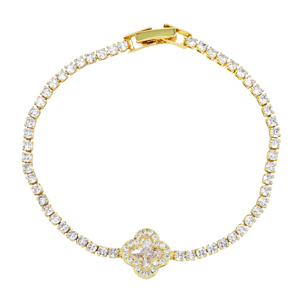Details • Size : 0.5" H, 7.4" L • Fold Over Closure • Discover refined elegance with this quatrefoil tennis bracelet, featuring a central floral-inspired design accented by shimmering stones. A timeless jewelry piece that blends sophistication and charm, perfect for both everyday wear and special occasions. • CZ Cubic Zirconia • Lead and Nickel Compliant