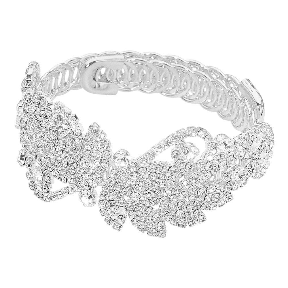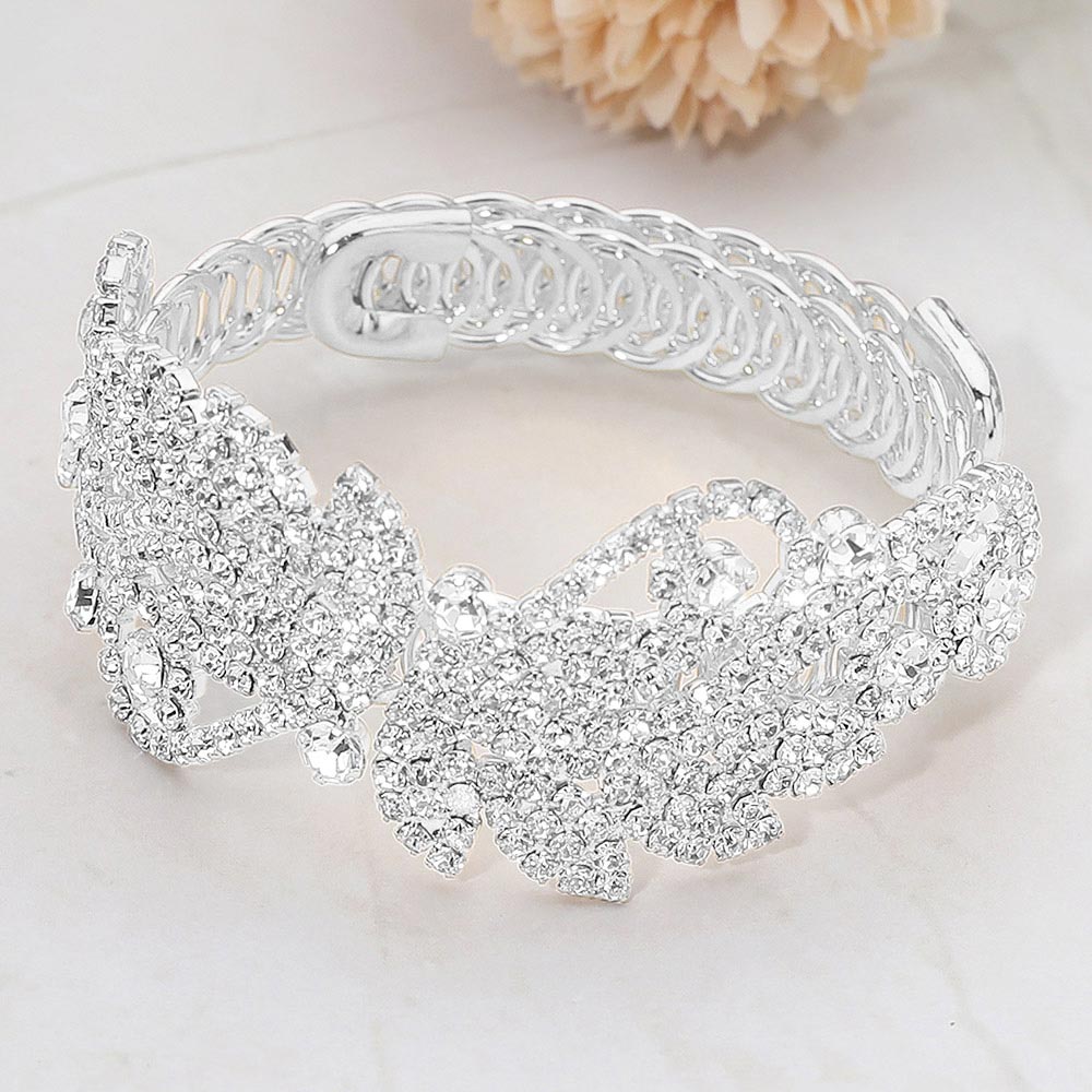 • Sparkling leaf-vine rhinestone bracelet featuring intricate crystal clusters, elegant scrolling accents, and a comfortable adjustable fit. A stunning accessory for formal events, weddings, and special occasions, adding refined shine to any look.