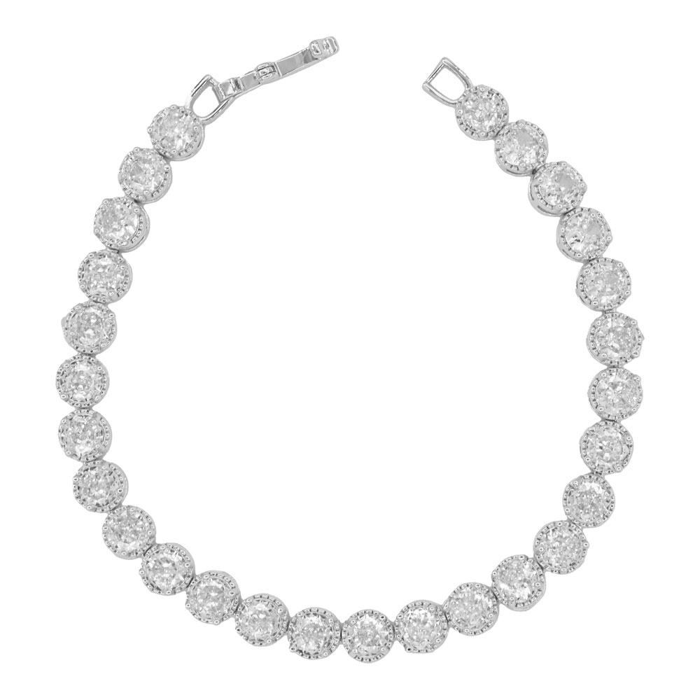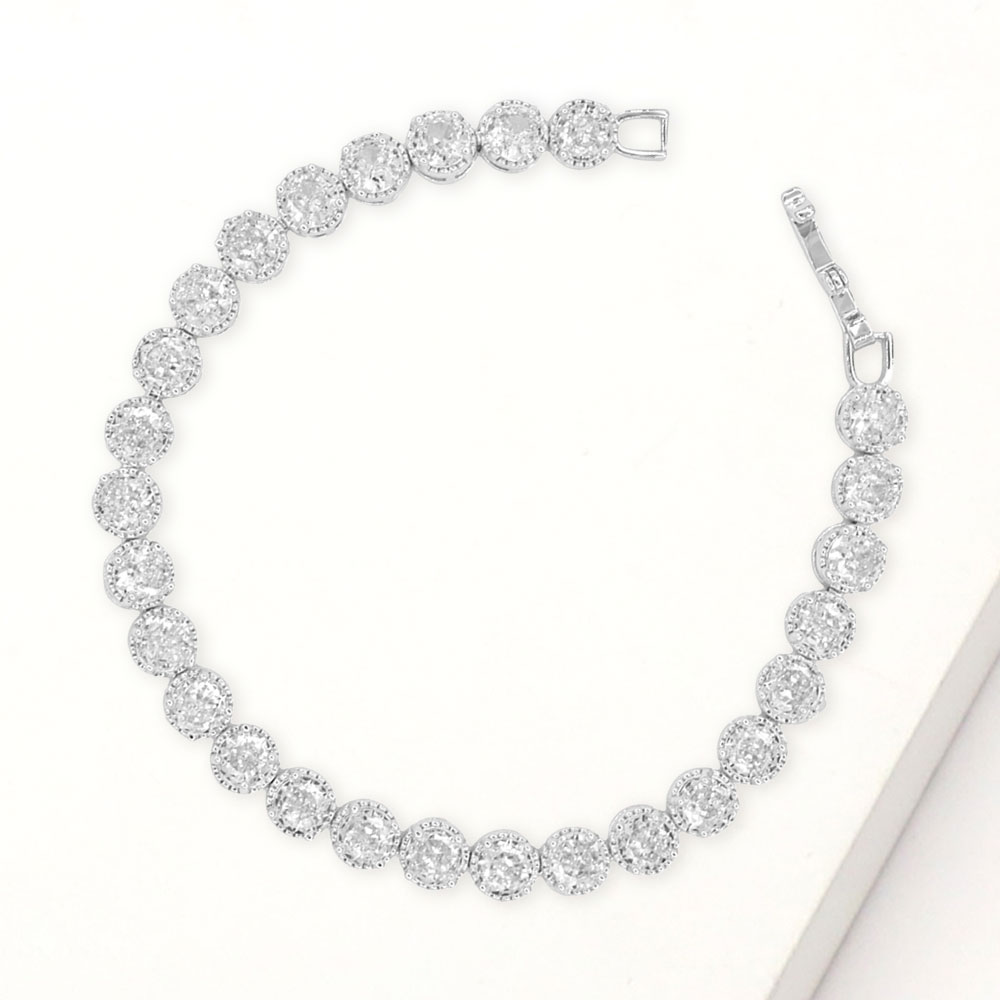 Details • Size : 0.25" H, 7.5" L • Fold Over Closure • Elevate your style with this stunning tennis bracelet featuring brilliant round-cut stones in a classic design. A timeless accessory perfect for everyday wear or special occasions, adding sophistication and radiant sparkle to any look. • CZ Cubic Zirconia • Lead and Nickel Compliant