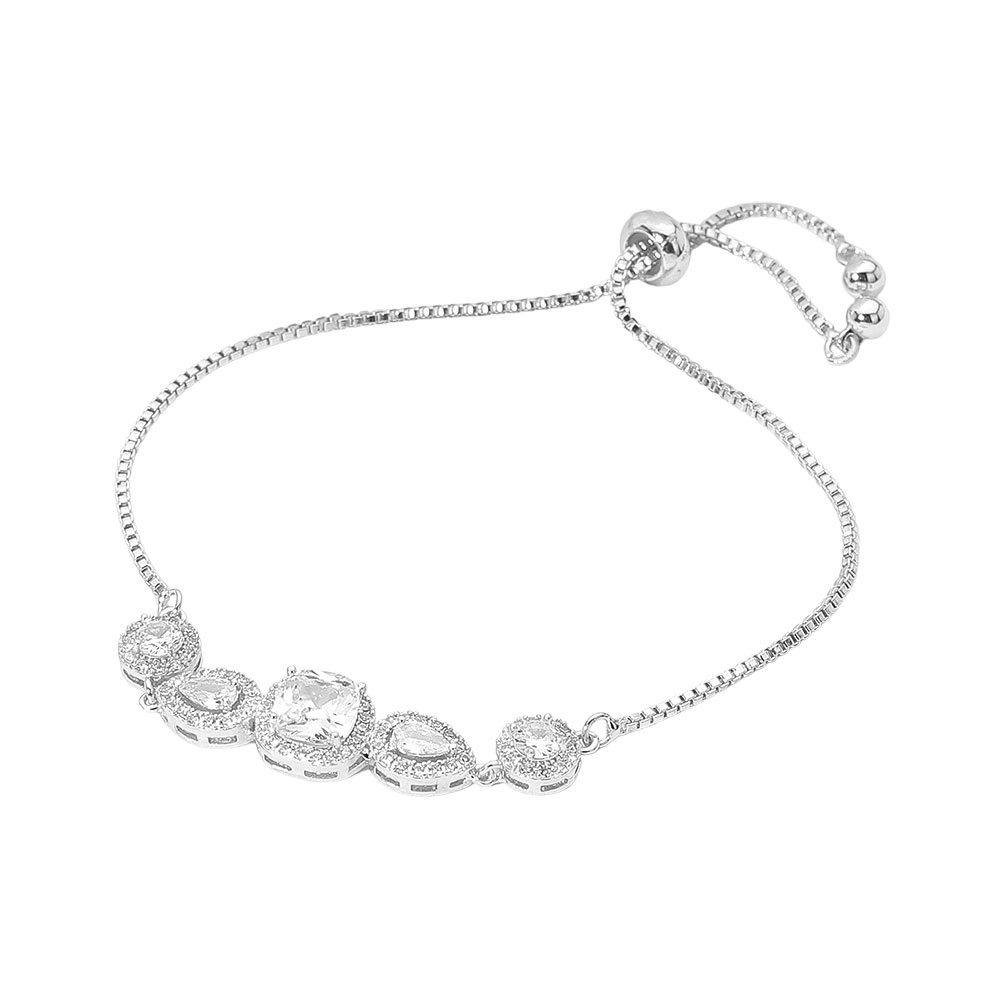 Details • Size : 0.4"H, 10" L • Adjustable • This adjustable crystal bracelet showcases a graceful arrangement of sparkling stones, exuding sophistication and charm. Its refined design makes it perfect for special occasions or everyday elegance, adding a radiant finishing touch to both classic and modern looks. • CZ Cubic Zirconia • Lead and Nickel Compliant