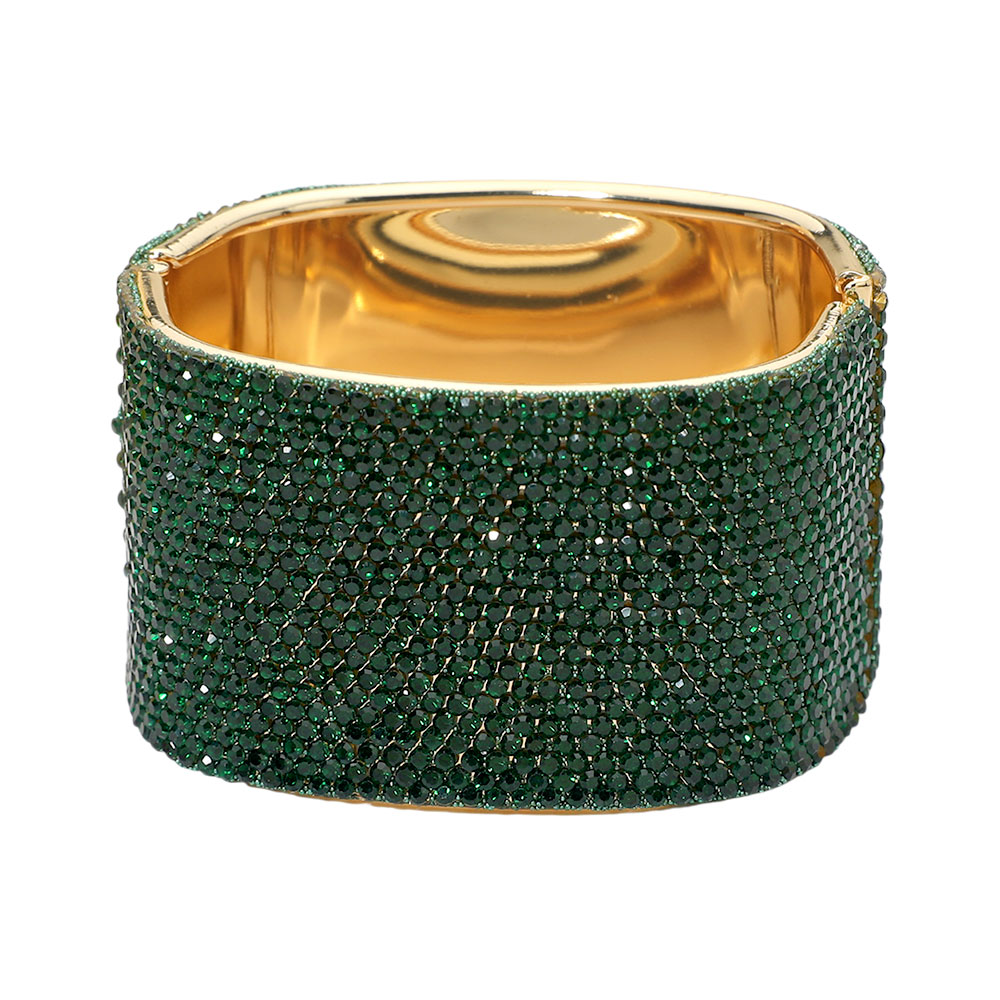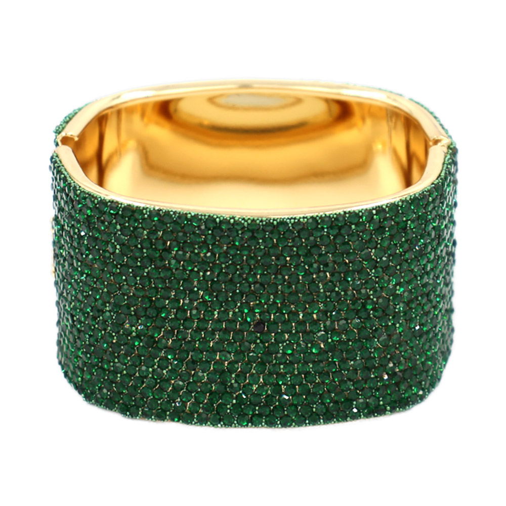• Statement bangle bracelet featuring a bold, wide silhouette with a smooth interior and secure hinge closure. Designed to elevate evening looks, bridal styling, and special occasions, this bracelet delivers high-impact shine and a polished finish for confident, standout accessorizing.