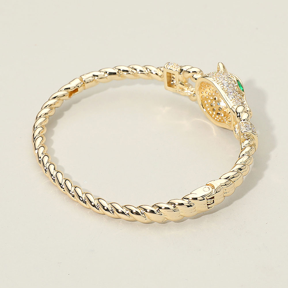 Details • Size : 0.7" H, 2.25" D • Hinged Closure • Embrace bold elegance with this panther head bracelet, showcasing shimmering crystal details and striking green eyes. The twisted band adds a refined touch, while the fierce yet sophisticated design makes it a standout accessory for both everyday wear and glamorous occasions. • CZ Cubic Zirconia