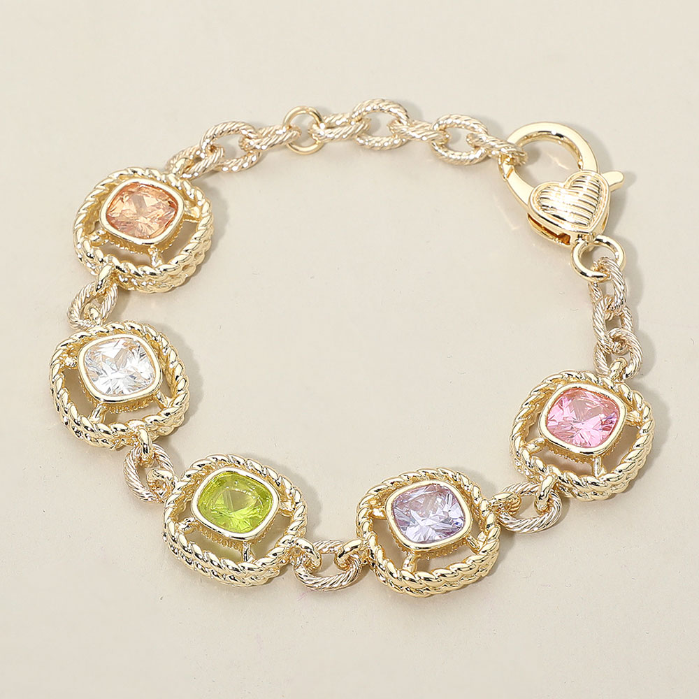 Details • Size : 0.7" H, 6.75" + 2" L • Lobster Clasp Closure • Add refined charm to your look with this decorative bracelet featuring a series of sparkling stones set in ornate frames. Its elegant chain design offers versatile styling for everyday wear or special occasions, making it a beautiful accent piece for any jewelry collection. • CZ Cubic Zirconia • Gold Dipped