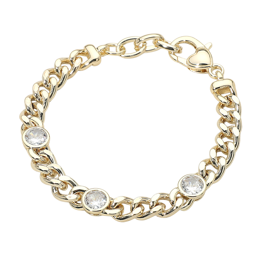 Details • Size : 0.3" H, 7.25" + 1.25" L • Lobster Clasp Closure • Stylish link chain bracelet highlighted with round CZ accents for a polished, modern look. Designed to balance bold structure with subtle sparkle, this bracelet is perfect for everyday wear or special occasions. Ideal for stacking or wearing solo as a refined statement piece. • Gold Dipped • CZ Cubic Zirconia
