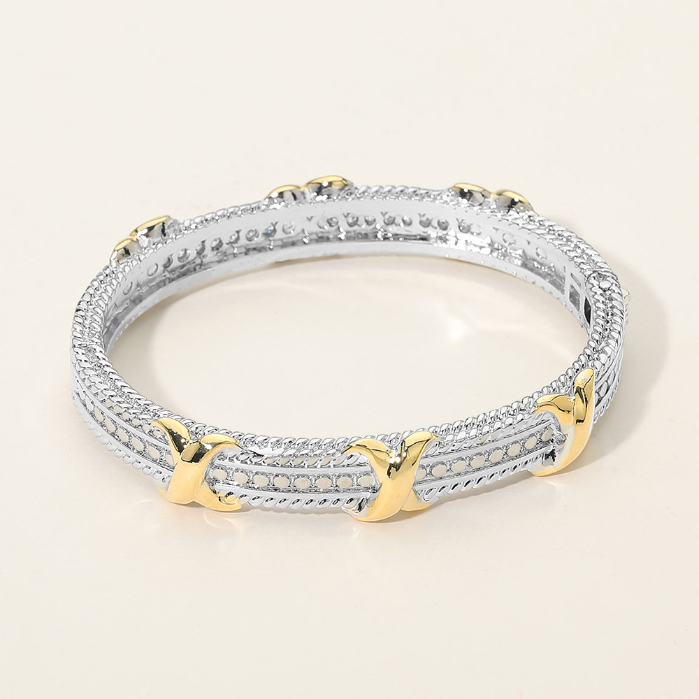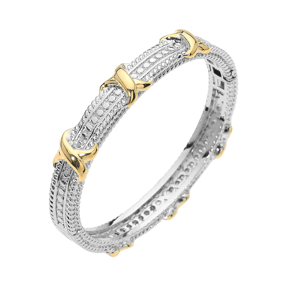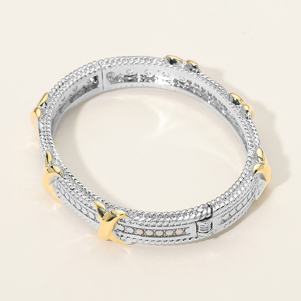 Details • Size : 0.4" H, 2.5" D • Hinged Closure • Sophisticated hinged bangle bracelet designed with repeating knotted accents and intricate textured detailing for a refined, dimensional look. Structured silhouette offers a secure, comfortable fit for daily wear or special occasions. Ideal for stacking or wearing alone, perfect for boutiques seeking timeless yet modern statement jewelry. • Gold Dipped