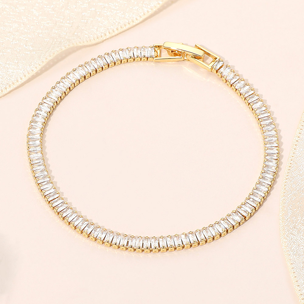 Details • Size : 0.1" H, 6.5" + 1" L • Fold Over Closure • Sophisticated baguette-cut tennis bracelet featuring a sleek row of sparkling stones and a secure clasp. Perfect for adding timeless elegance to any outfit, this bracelet offers refined brilliance and effortless glamour for both special occasions and everyday wear. • Lead and Nickel Compliant • Gold Dipped