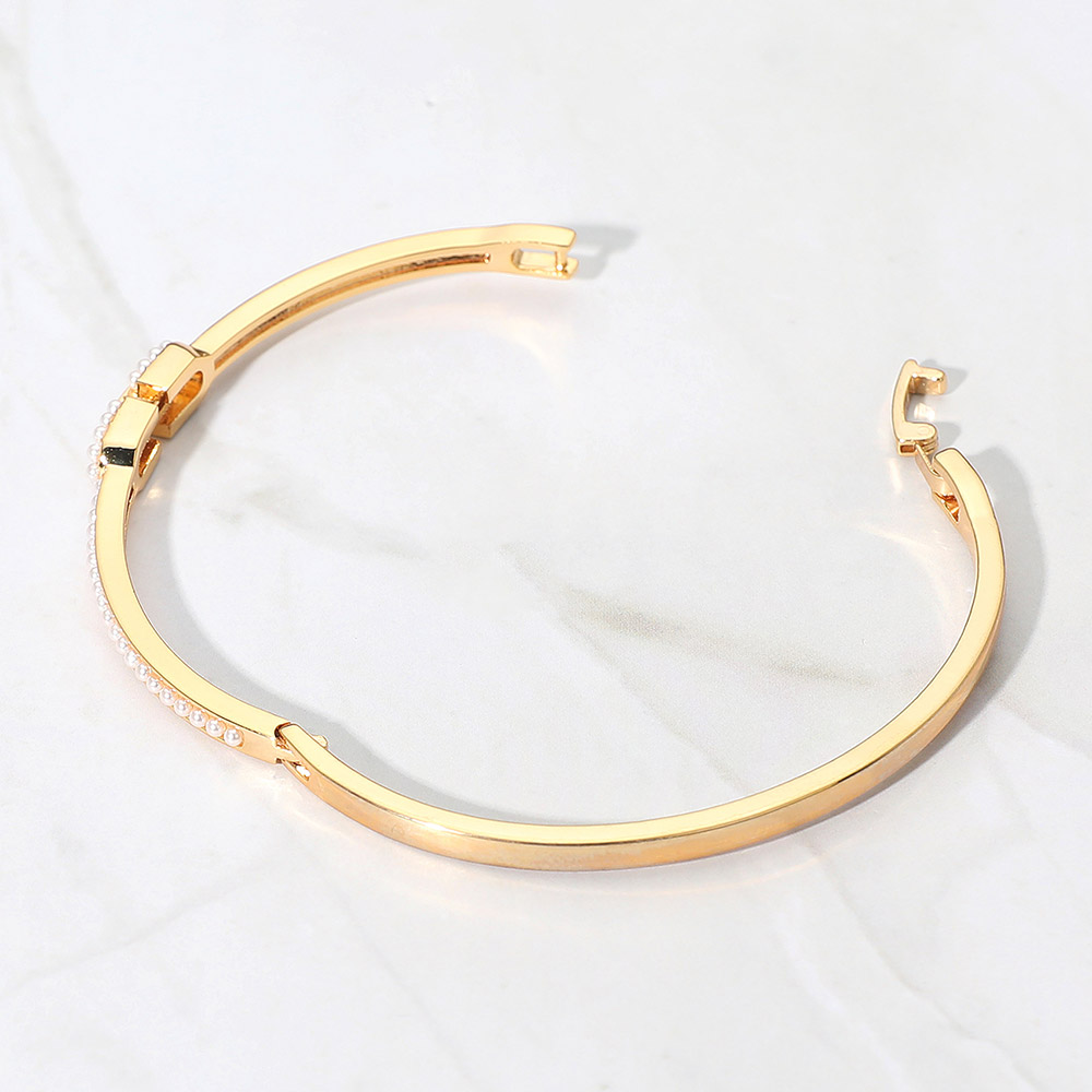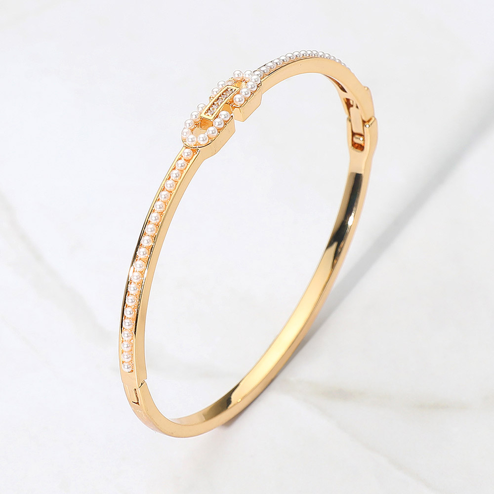Details • Size : 0.25" H, 2.25" D • Hinged Closure • Elevate your style with this pearl-accent bangle bracelet featuring a sleek design and delicate detailing. Perfect for both casual sophistication and evening glamour, it’s a timeless accessory that adds polish, grace, and modern refinement to any outfit. • Gold Dipped
