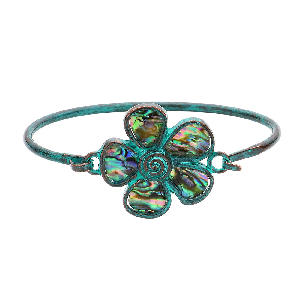 Details • Size : 1.1" H, 2.3" D • Hook Closure • Embrace natural elegance with this abalone flower spiral bangle bracelet. Featuring iridescent floral petals with a central spiral accent, this piece combines artistic charm with a touch of oceanic beauty. Perfect for adding color and sophistication to your everyday or evening style. • Lead and Nickel Compliant