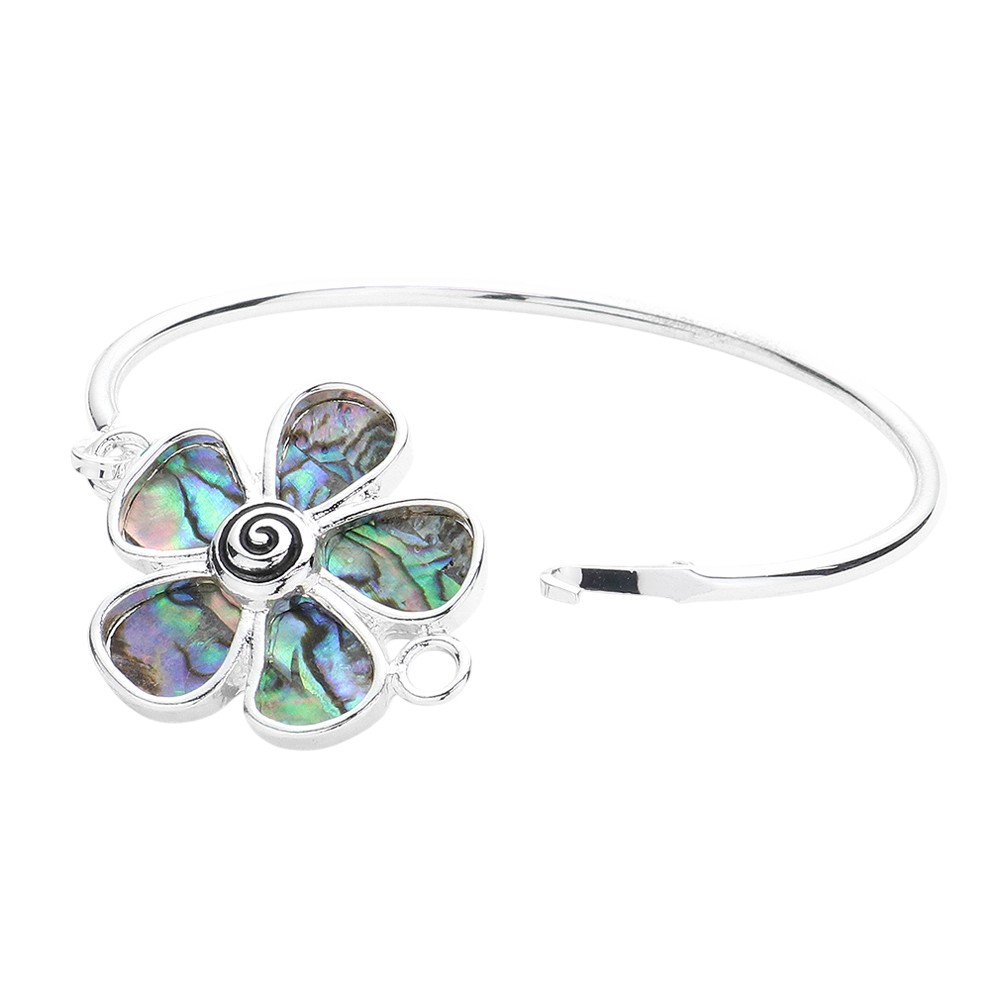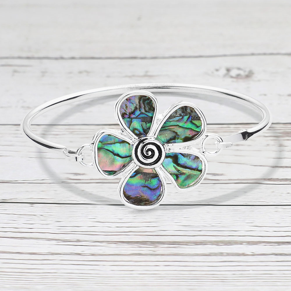Details • Size : 1.1" H, 2.3" D • Hook Closure • Embrace natural elegance with this abalone flower spiral bangle bracelet. Featuring iridescent floral petals with a central spiral accent, this piece combines artistic charm with a touch of oceanic beauty. Perfect for adding color and sophistication to your everyday or evening style. • Lead and Nickel Compliant