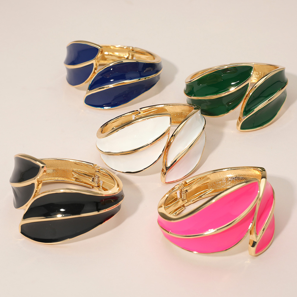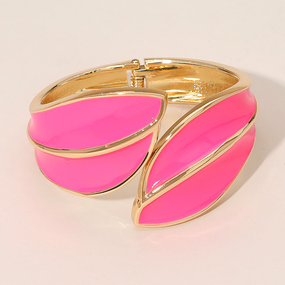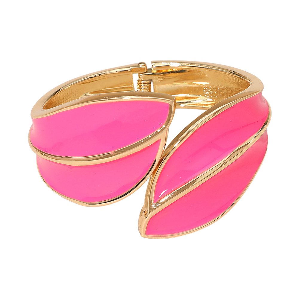 • Make a sophisticated statement with this Abstract Leaf Cuff Bracelet. This wide, hinged bangle features a bold, sculptural design with two overlapping, curved leaf shapes finished in a sleek, high-gloss enamel. The smooth, shiny enamel is framed by a highly polished metallic tone, creating a striking contrast and a luxurious, dimensional look. The wide cuff style is perfect for formal events or adding a dramatic, modern touch to any outfit. It secures easily with a durable hinge closure.