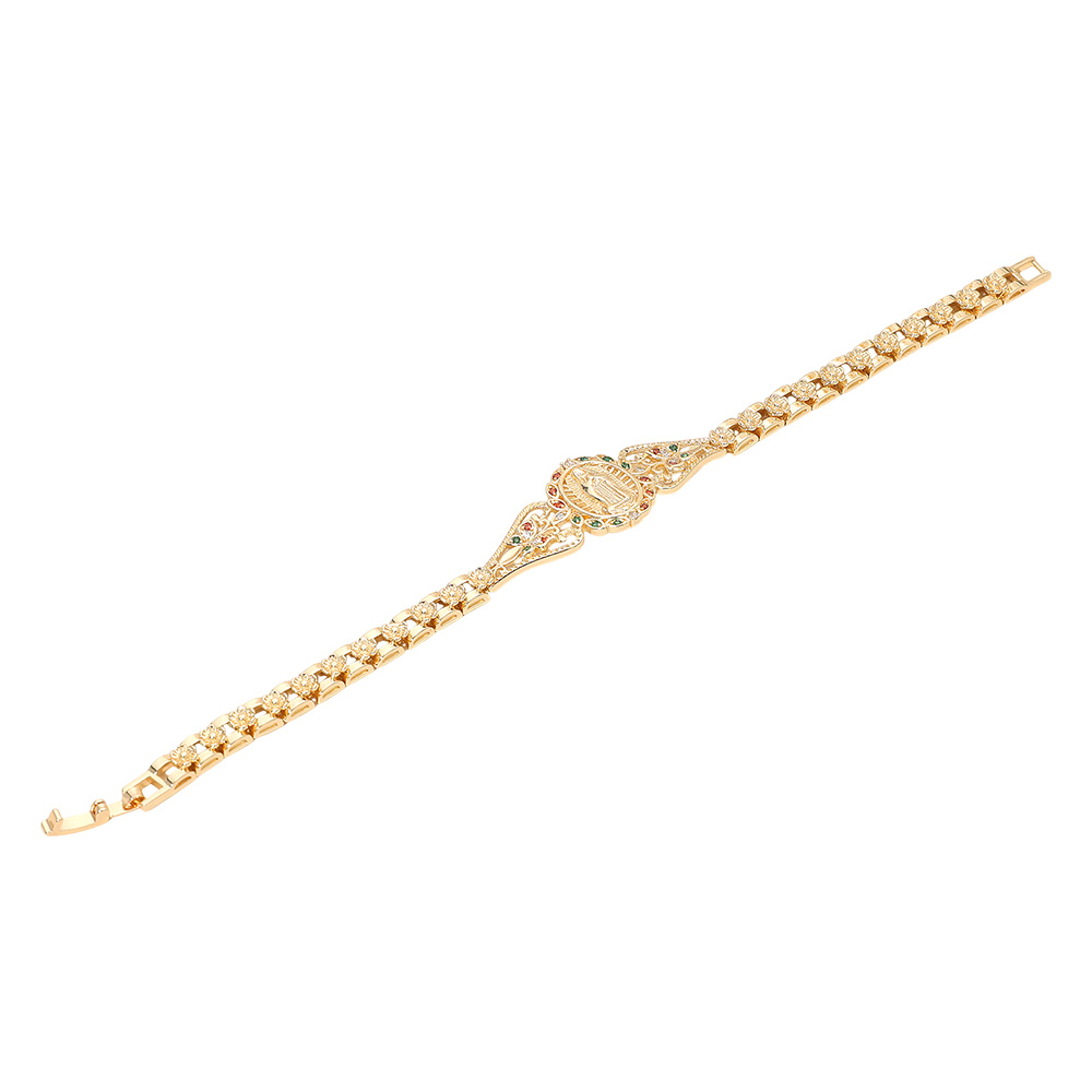 Details • Size : 0.75" H, 7.25" + 0.5" L • Fold Over Closure • Elegant filigree bangle bracelet featuring an religious ornate oval medallion centerpiece surrounded by sparkling gem accents. Its intricate openwork design adds a touch of vintage charm, making it a beautiful statement accessory for special occasions or everyday sophistication. • Brass • CZ Cubic Zirconia