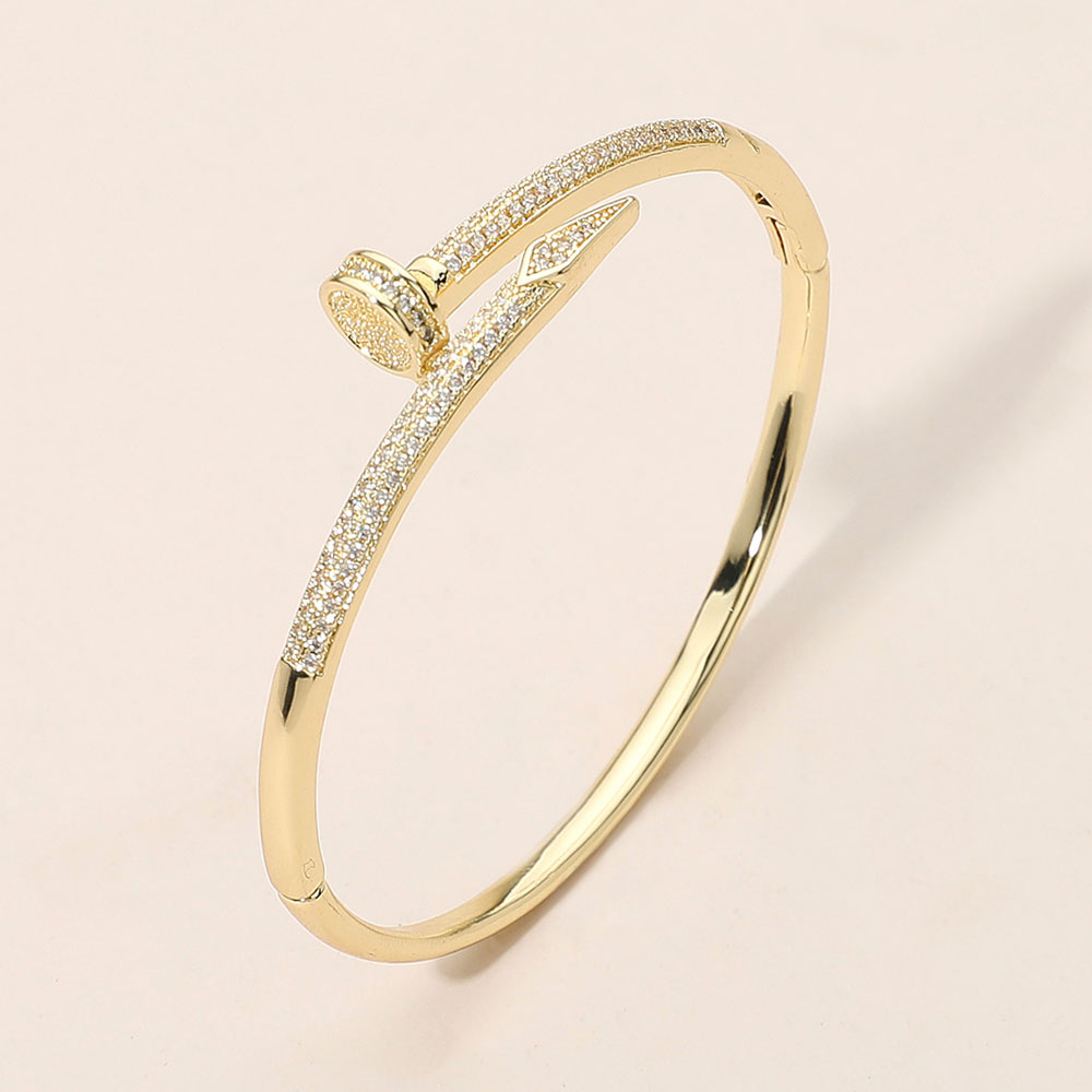 Details • Size : 0.5" H, 2.4" D • Hinged Closure • This elegant cz stone paved nailhead bangle bracelet showcases a sleek, modern silhouette accented with sparkling crystals. Designed for sophistication and style, it offers a statement of refined luxury that pairs beautifully with both everyday and formal looks, adding subtle brilliance to any outfit. • CZ Cubic Zirconia