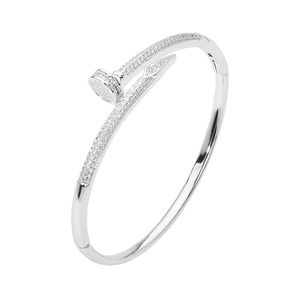 Details • Size : 0.5" H, 2.4" D • Hinged Closure • This elegant cz stone paved nailhead bangle bracelet showcases a sleek, modern silhouette accented with sparkling crystals. Designed for sophistication and style, it offers a statement of refined luxury that pairs beautifully with both everyday and formal looks, adding subtle brilliance to any outfit. • CZ Cubic Zirconia