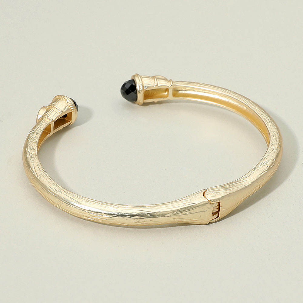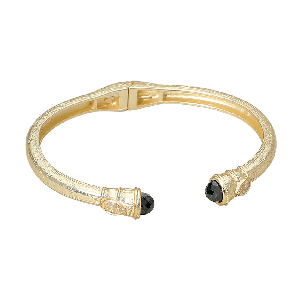 Details • Size : 0.3" H, 2.5" D • Hinged Closure • Sophisticated open cuff bangle featuring gemstone accents on each end with intricate detailing. A timeless bracelet that blends elegance with a bold touch, perfect for both casual wear and special occasions. • CZ Cubic Zirconia