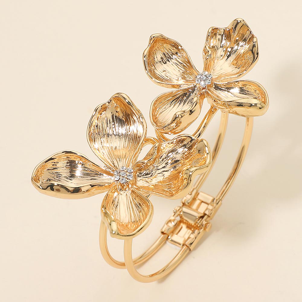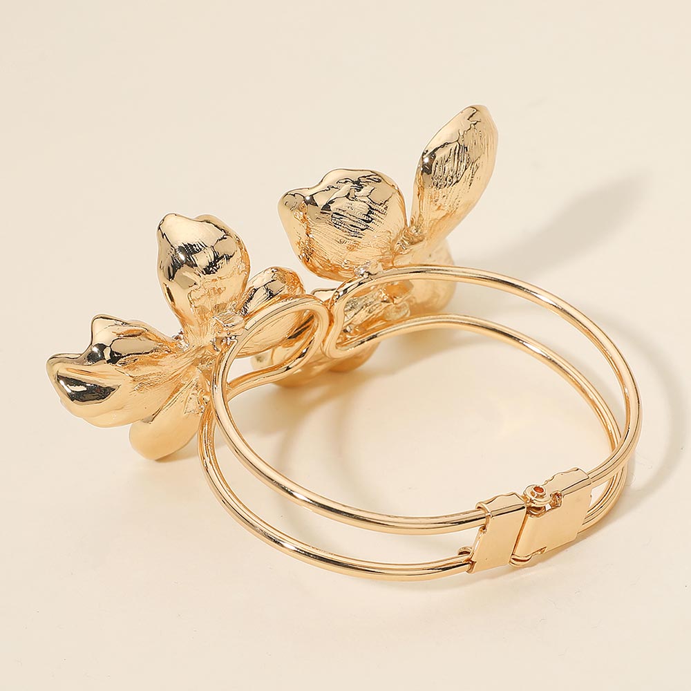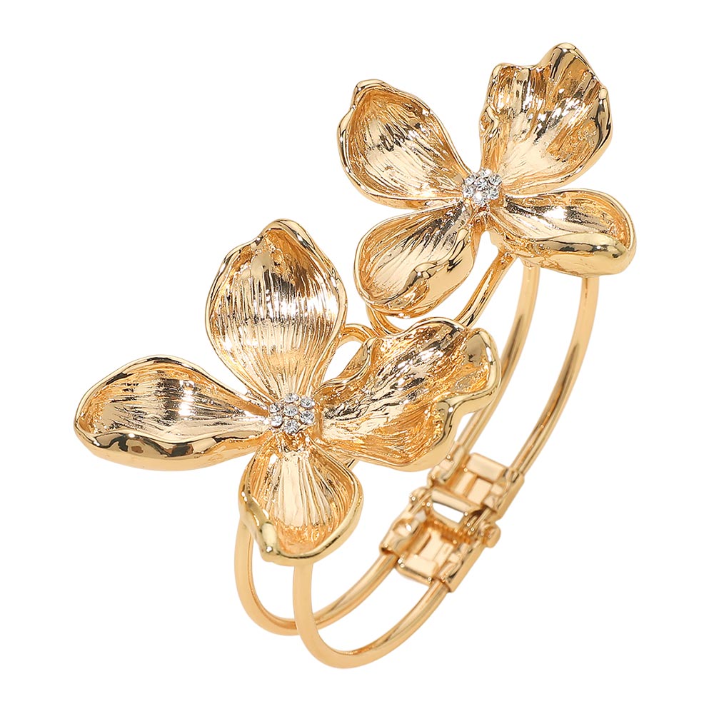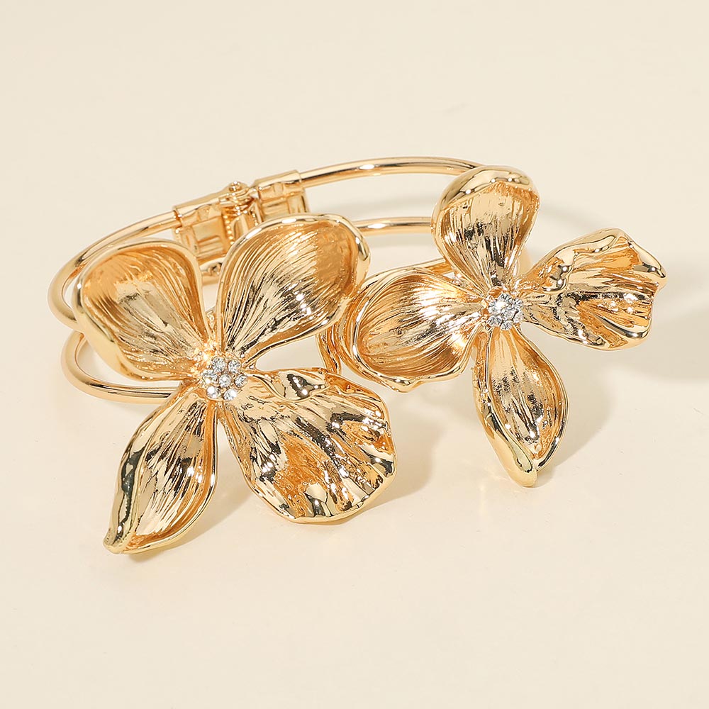 Details • Size : 1.75" H, 2.5" D • Hinged Closure • Elegant floral cuff bracelet featuring sculpted flower details for a bold yet refined look. Designed to elevate everyday outfits and special occasion styling. Ideal for boutiques, gift assortments, and trend-driven collections seeking feminine, eye-catching accessories with strong visual impact and versatile wear appeal. • Lead and Nickel Compliant