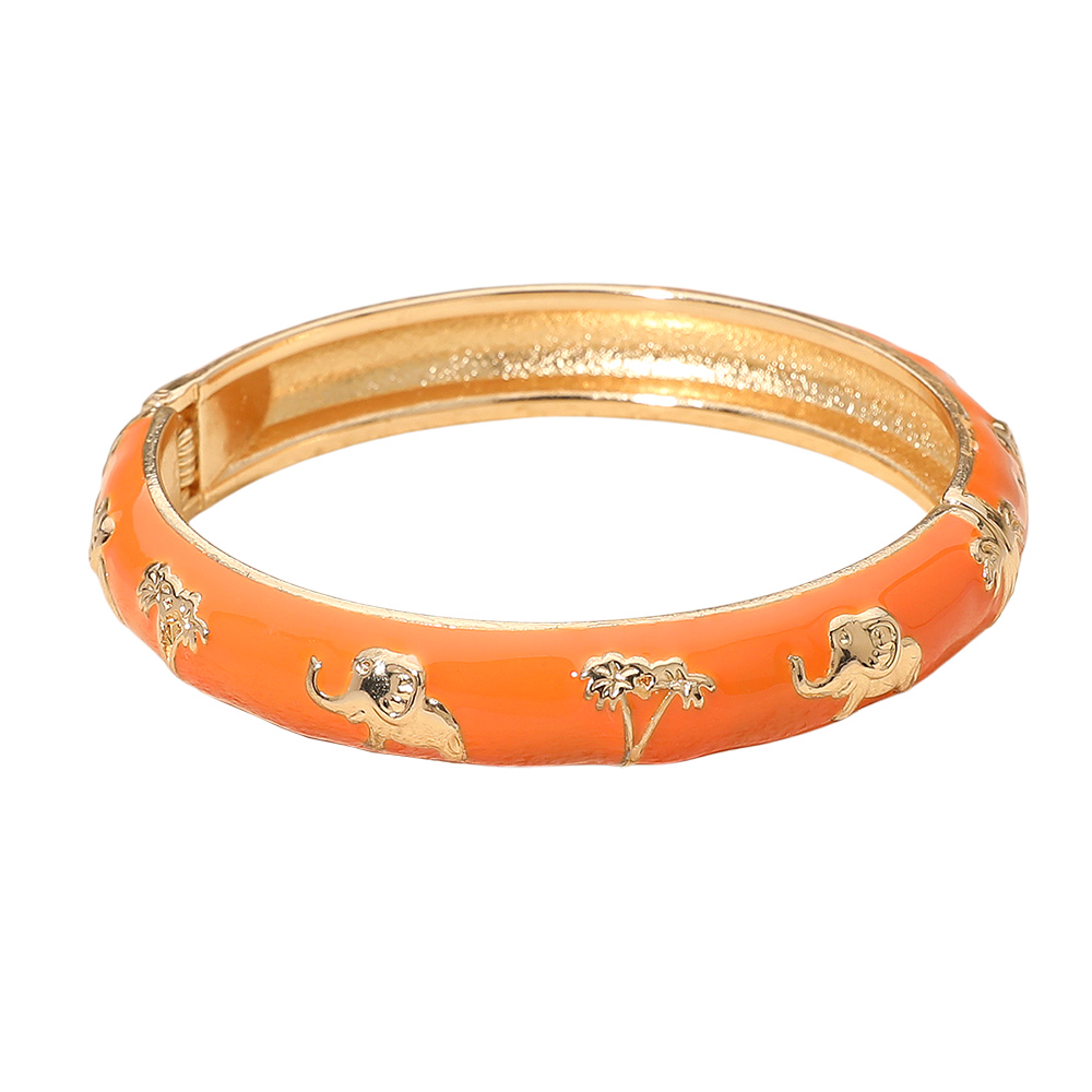 • Elegant hinged bangle bracelet featuring embossed elephant and tree motifs for a touch of exotic charm. The smooth enamel finish and polished edges create a refined look, making it a perfect accessory to complement everyday outfits or add flair to special occasion styles.