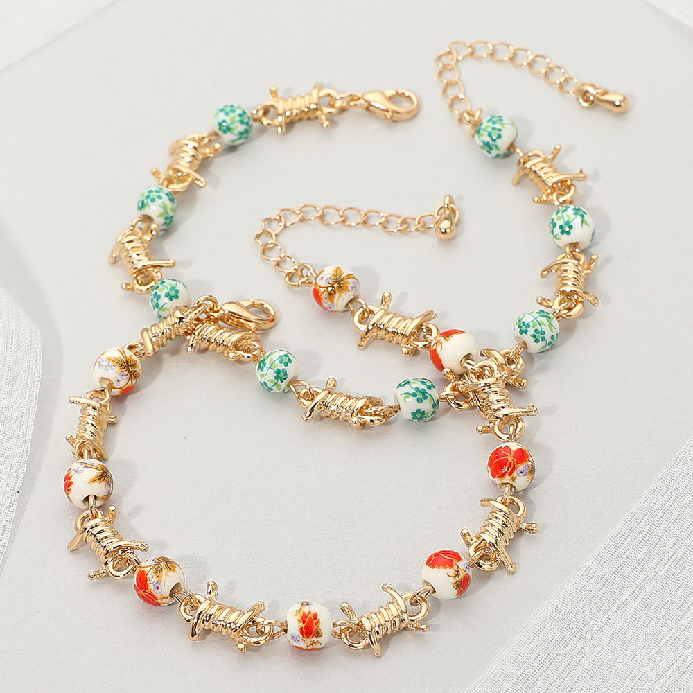 Floral Ceramic Ball Metal Rope Wrap Link Bracelet