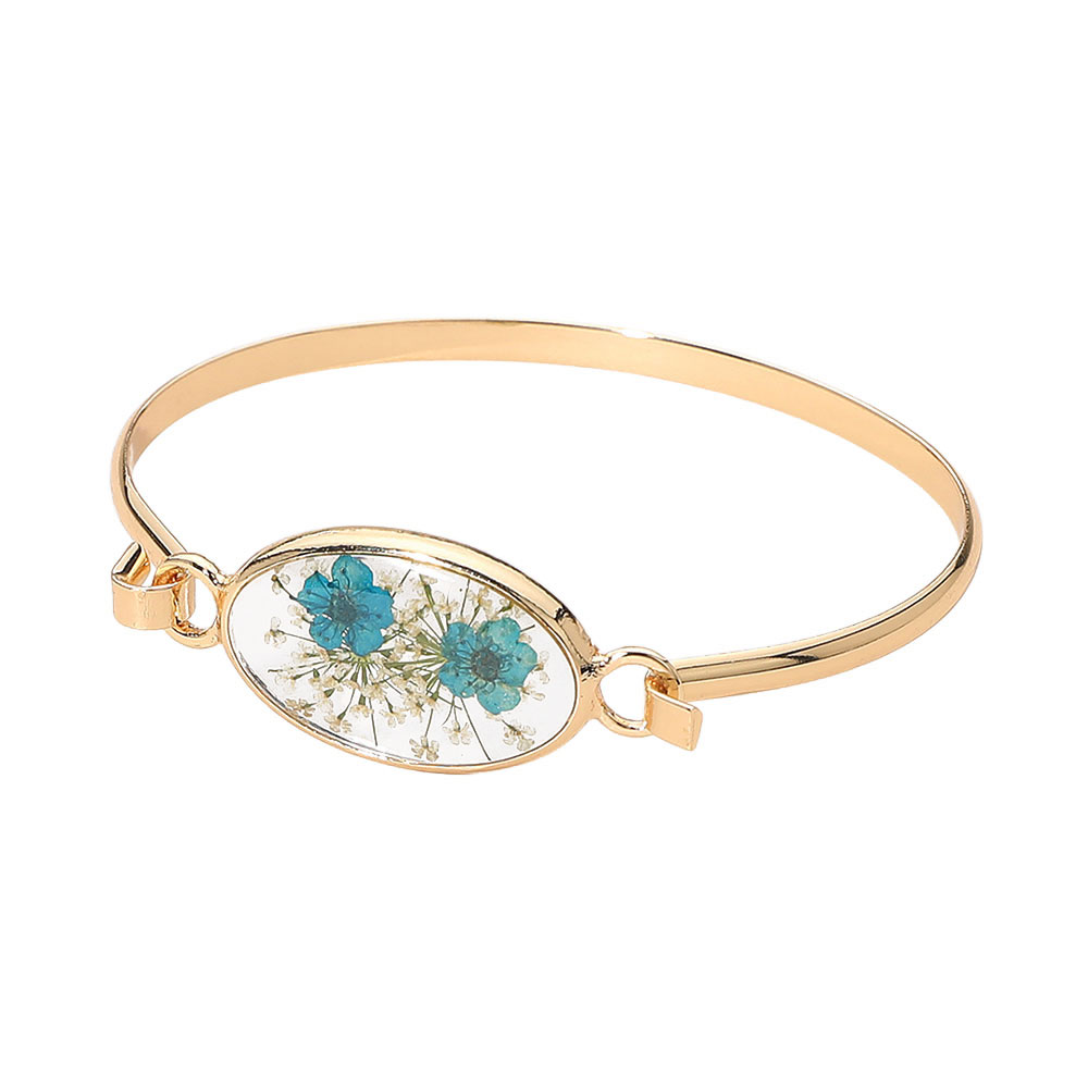 Details • Size : 0.7" H, 2.4" D • Hook Closure • Elevate everyday style with this Floral Encased Oval Bangle Bracelet, featuring a delicate preserved-flower centerpiece inside a sleek oval frame. Designed for comfortable wear and easy layering, it adds a refined, nature-inspired accent to casual looks, work outfits, or special occasions and makes a thoughtful gift choice. • Lead and Nickel Compliant