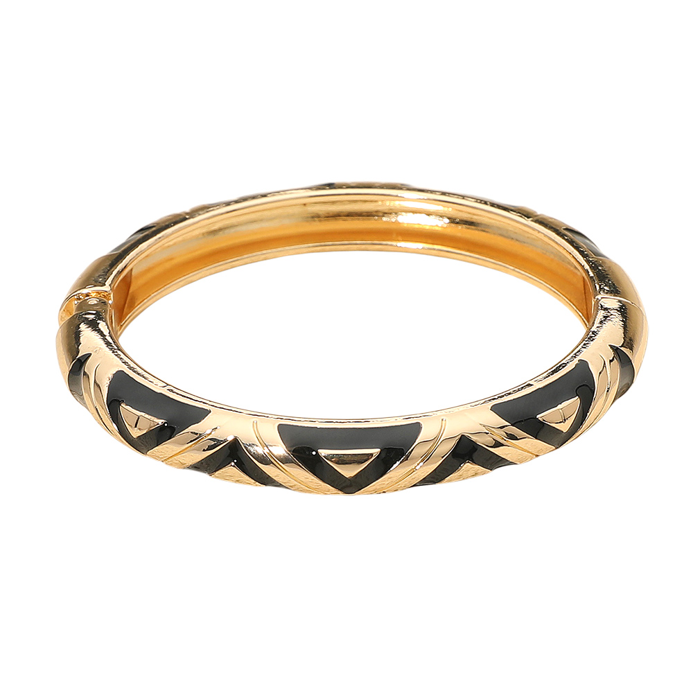 • Chic geometric hinged bangle bracelet featuring sleek enamel inlay and a polished metallic finish. Its modern pattern adds a stylish accent to any outfit, perfect for layering or wearing alone for an elegant statement. Ideal for both everyday wear and sophisticated occasions.