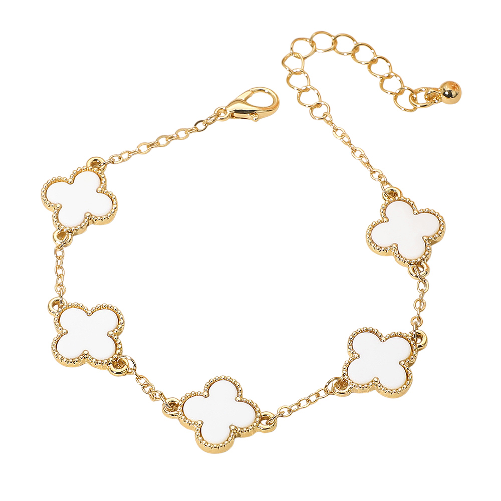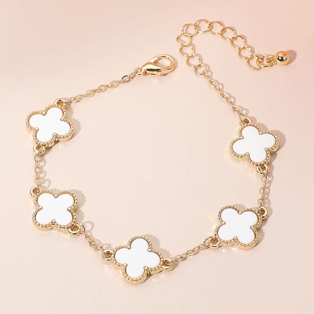 • This elegant four-leaf cquatrefoil chain bracelet features five delicate charms linked by a fine adjustable chain, symbolizing luck and beauty. Its refined design blends timeless sophistication with a modern edge, making it an ideal accessory for both daily wear and special occasions.