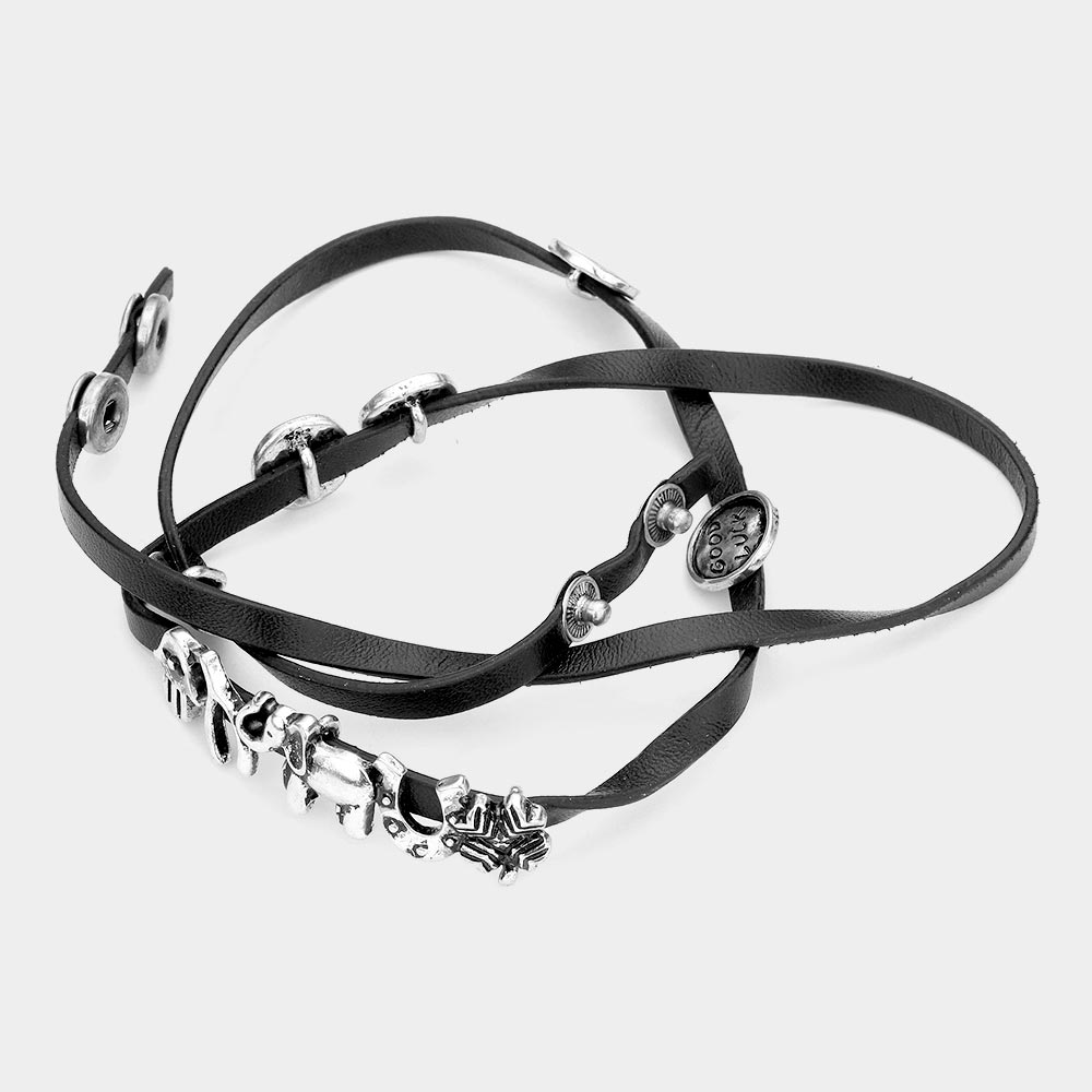 Message Disc Cluster Evil Eye Hamsa Hand Elephant Leather Wrap Bracelet