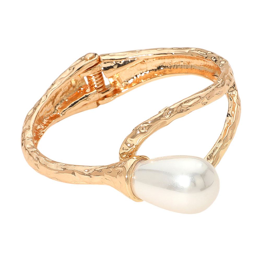 Pearl Accent Hammered Metal Hinged Bangle Bracelet