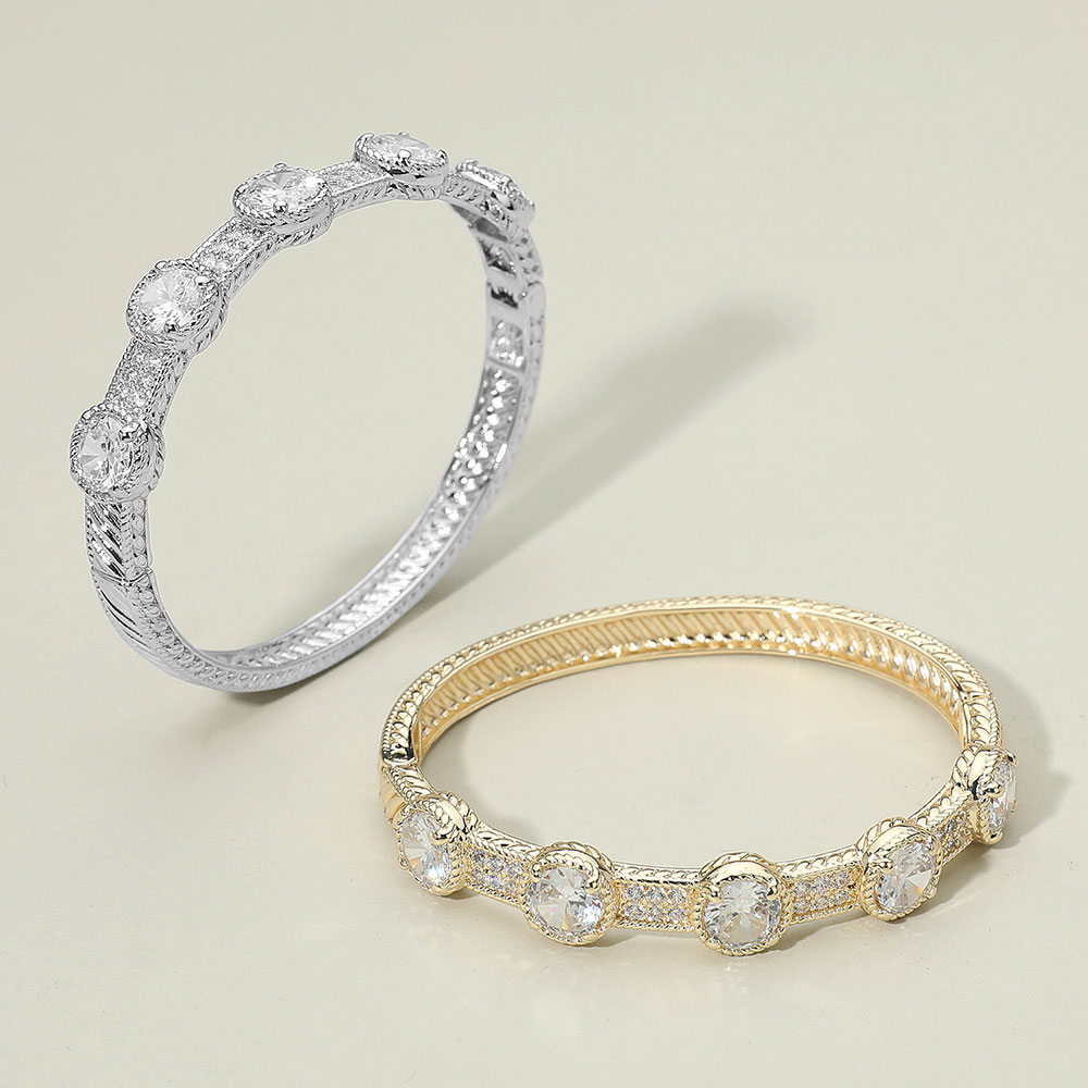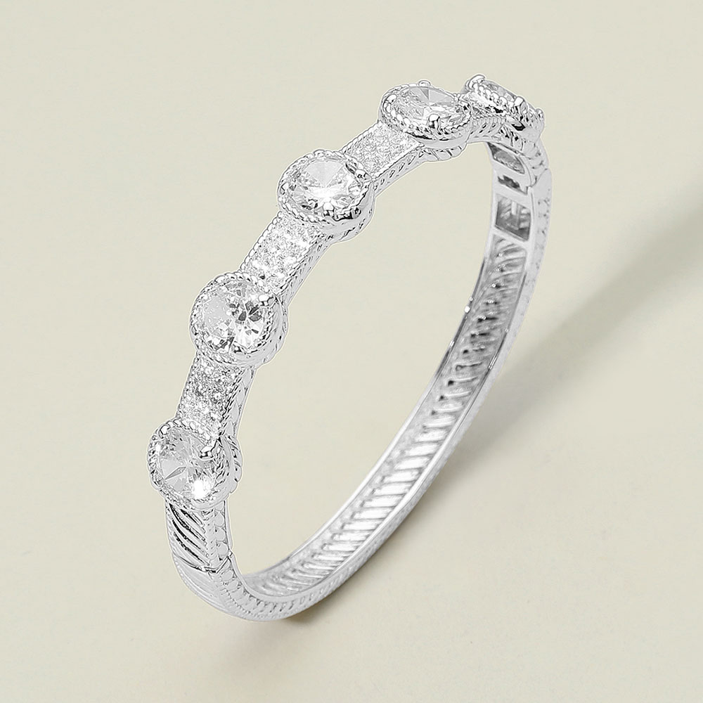 • Elegant bangle bracelet adorned with sparkling round cut stones and intricate detailing. A refined accessory that adds timeless sophistication, perfect for weddings, parties, or elevating everyday looks.