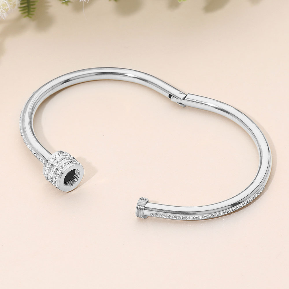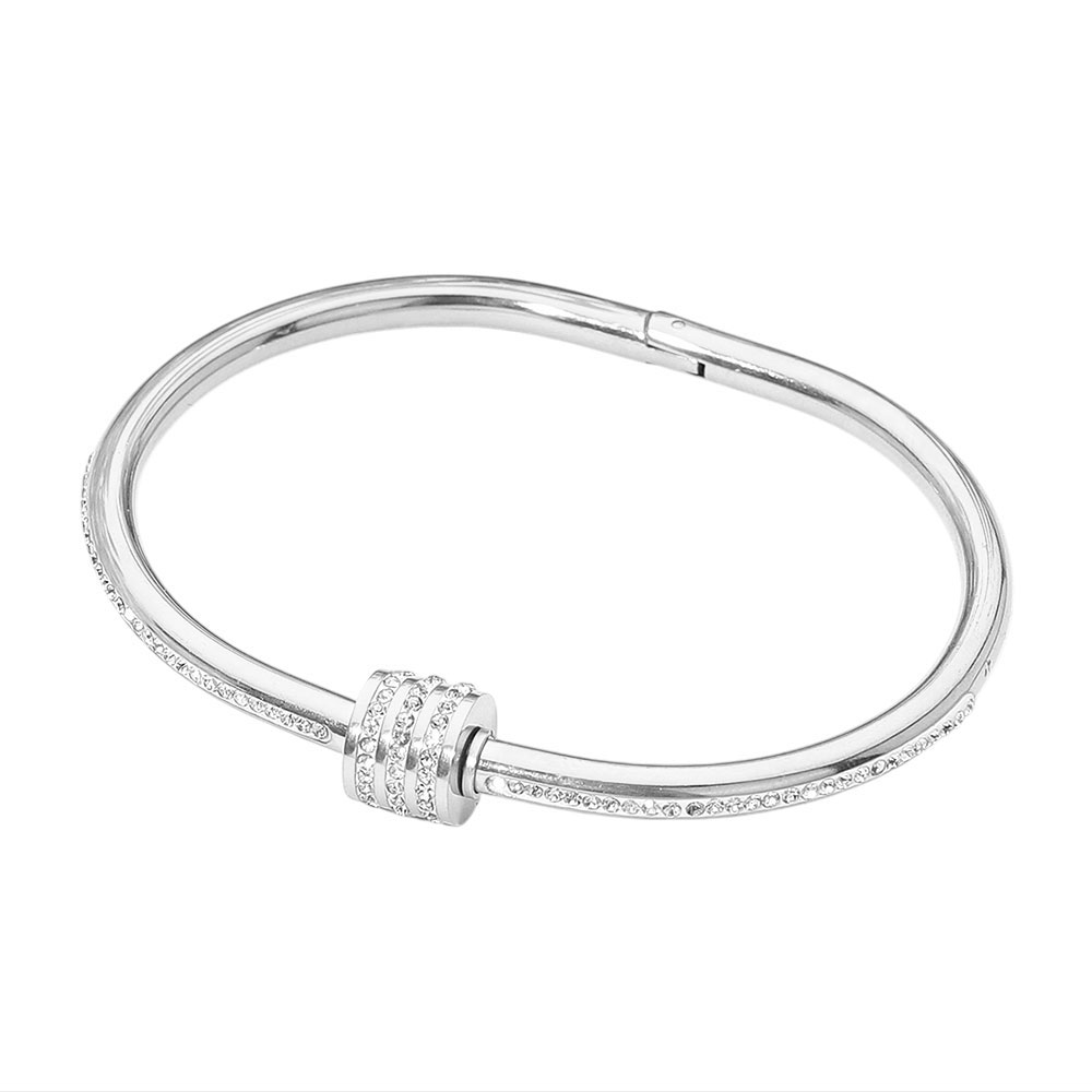 Details • Size : 0.4" H, 2.4" D • Hinged Closure • Water Resistant • Sleek hinge bangle bracelet featuring a signature crystal-accent slider bar detail for modern elegance and subtle sparkle. Designed for effortless wear, this refined accessory transitions seamlessly from everyday outfits to evening styling, delivering a polished statement worn solo or layered. • Hypoallergenic • Stainless Steel
