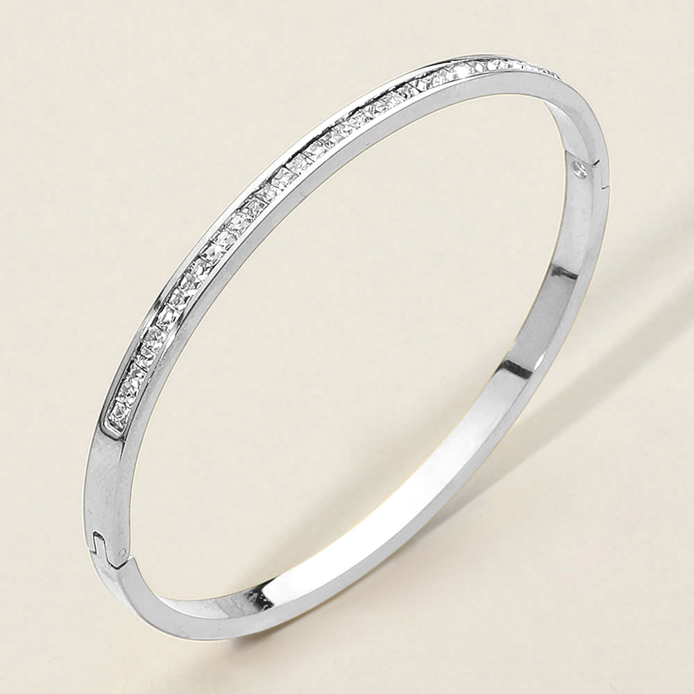 Details • Size : 0.2" H, 2.4" D • Hinged Closure • Water Resistant • Sleek hinged bangle bracelet with a row of sparkling rhinestone accents. Classic and elegant design perfect for stacking or wearing solo to add a refined touch to day or evening looks. • Stainless Steel
