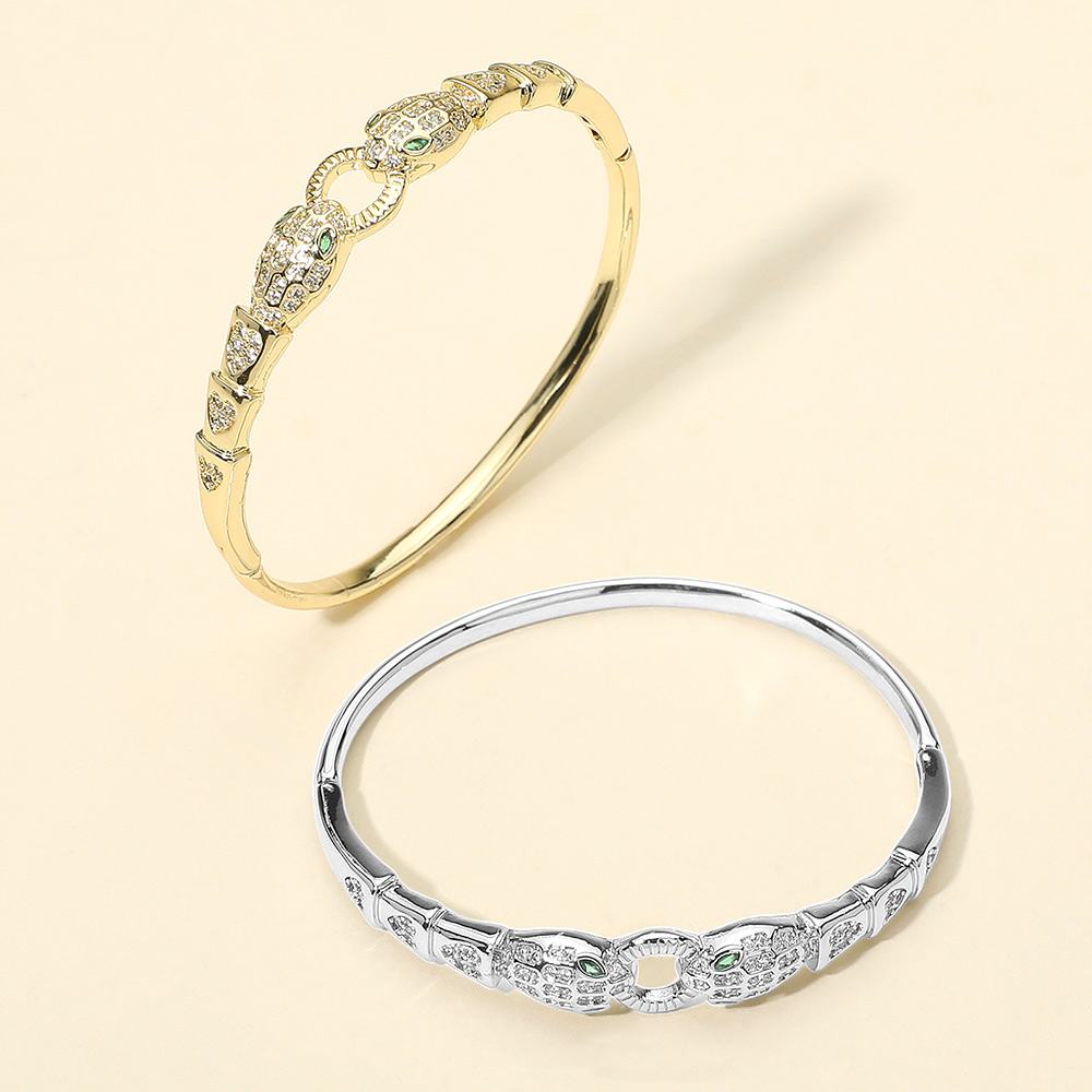 Details • Size : 0.4" H, 2.25" D • Hinged Closure • Fierce yet refined, this gold bangle bracelet showcases dual panther heads adorned with sparkling crystals and striking green eyes. A bold accessory that symbolizes strength and elegance, making it the perfect statement piece for evening looks or everyday sophistication. • CZ Cubic Zirconia • Sterling Silver Dipped