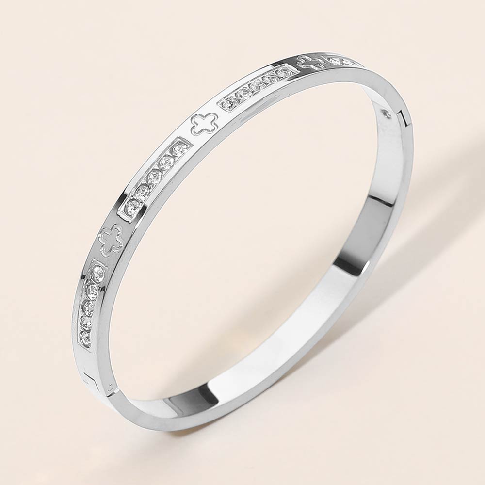 Stainless Steel CZ Accent Quatrefoil Engraved Hinged Bangle Bracelet Stainless Steel CZ Accent Quatrefoil Engraved Hinged Bangle Bracelet Stainless Steel CZ Accent Quatrefoil Engraved Hinged Bangle Bracelet