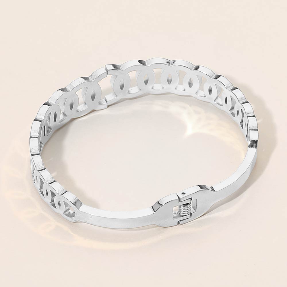 Details • Size : 0.5" H, 2.3" D • Hinged Closure • Sophisticated hinged bracelet designed with layered circle link shapes and sparkling cz accents. This sleek statement piece offers a polished look with easy wear, making it perfect for daily styling, evening outfits, or stacking with other bracelets for a refined, modern finish. • CZ Cubic Zirconia • Stainless Steel