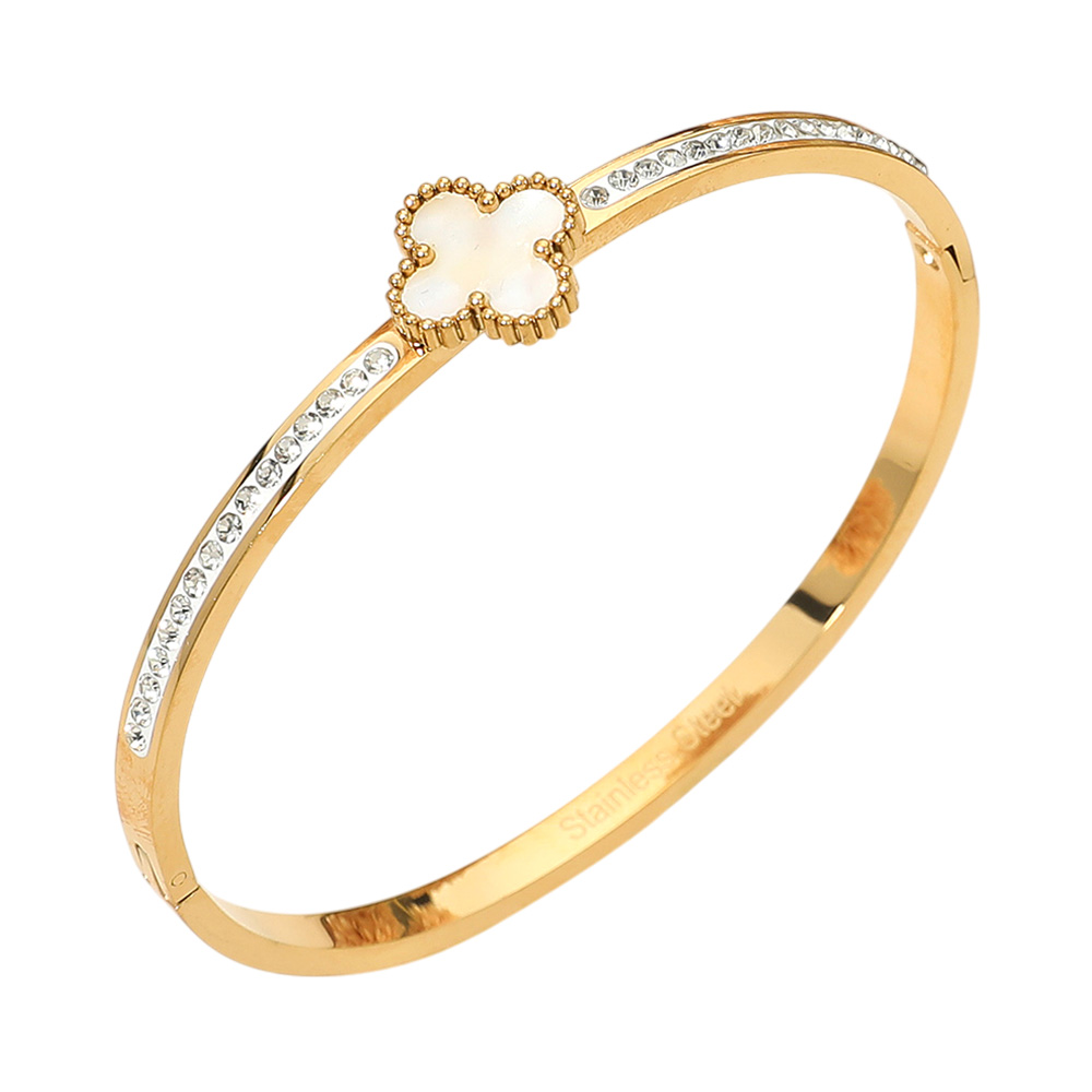 Stainless Steel CZ Paved Quatrefoil Center Hinged Bangle Bracelet Stainless Steel CZ Paved Quatrefoil Center Hinged Bangle Bracelet Stainless Steel CZ Paved Quatrefoil Center Hinged Bangle Bracelet